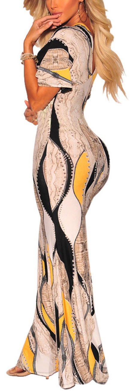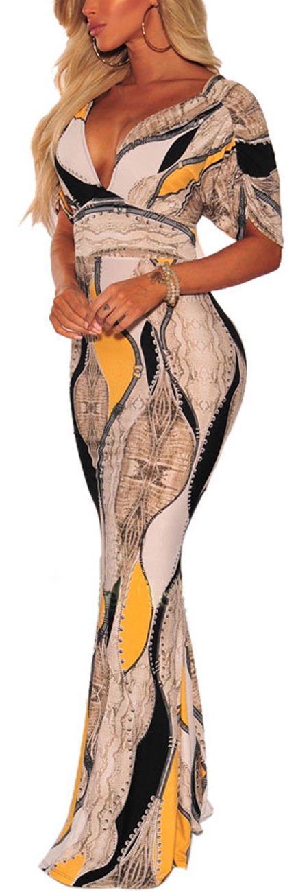 Bodycon Maxi Dresses for Women Havana Nights Sexy Short Sleeve Floral V Neck Formal Long Floor Length Mermaid Dress Beach Vacation Beige