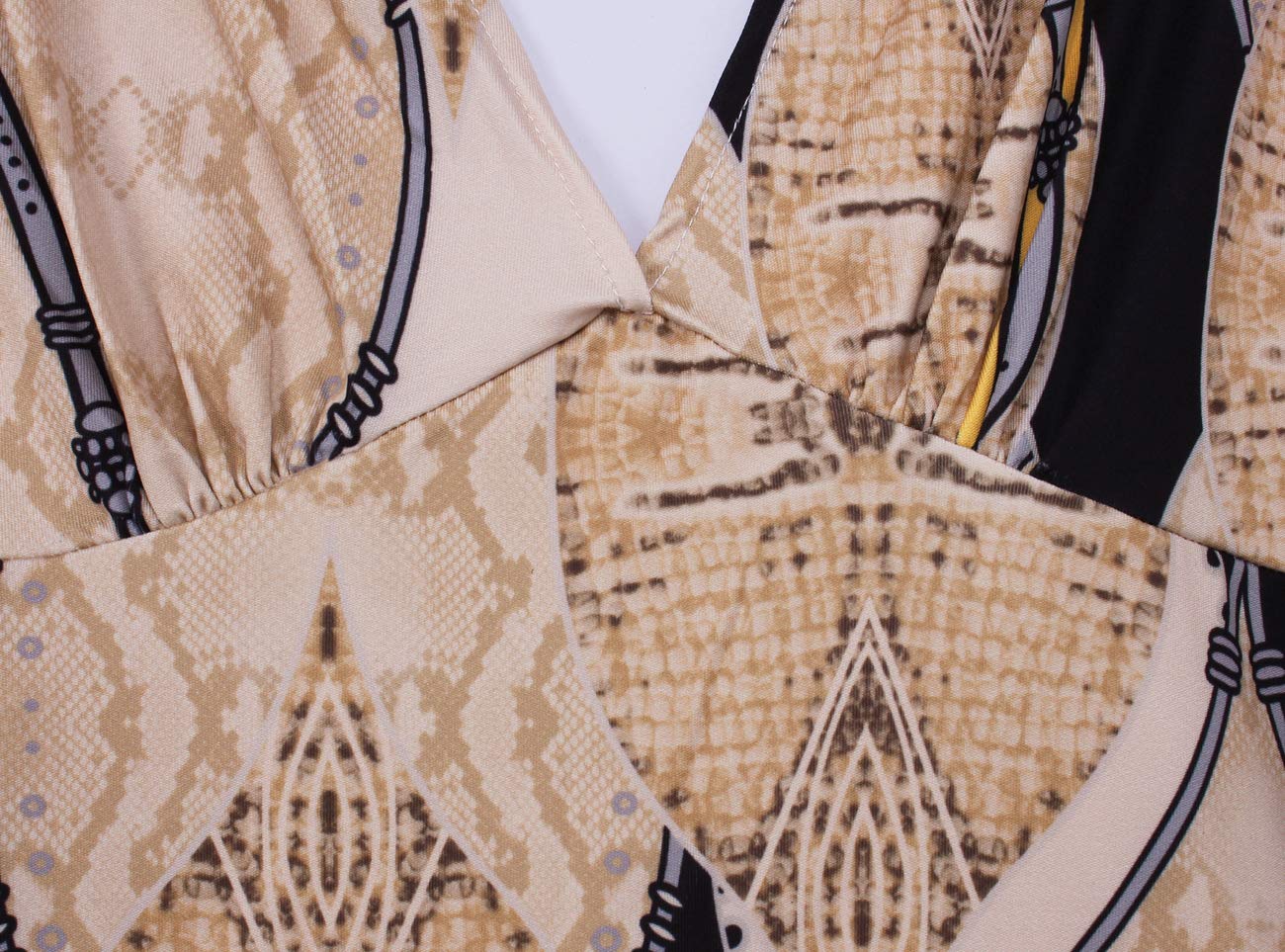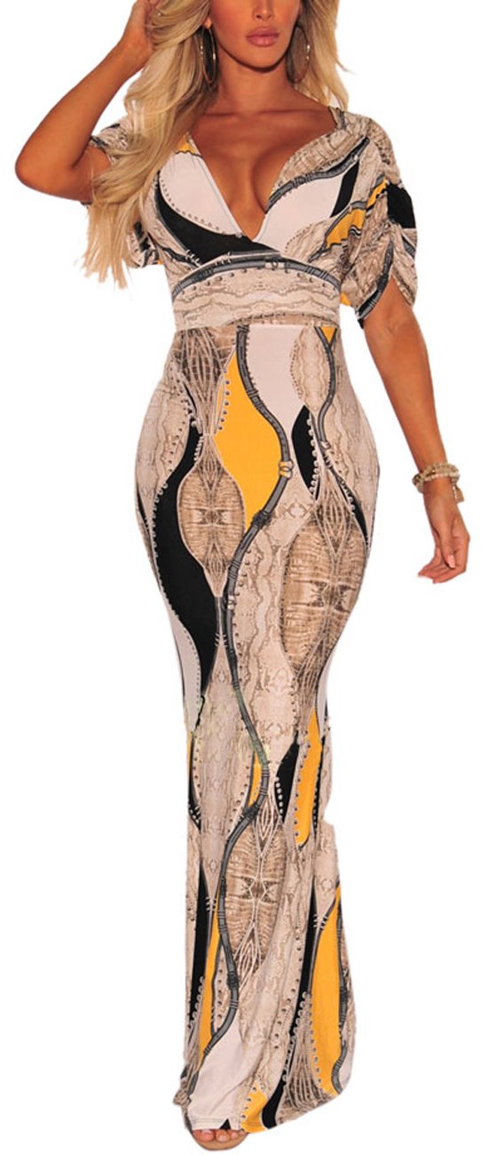 • Deep V neck,backless V,mermaid,short ruffles sleeves,floor length,floral printing with a pixellated snake skin and wavy lines.