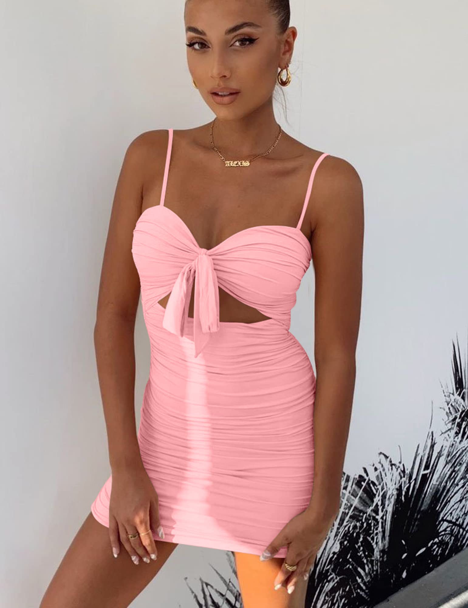 BORIFLORS Women's Sexy Bodycon Cut Out Ruched Backless Spaghetti Strap Mini Club Party Dresses, Small, Pink