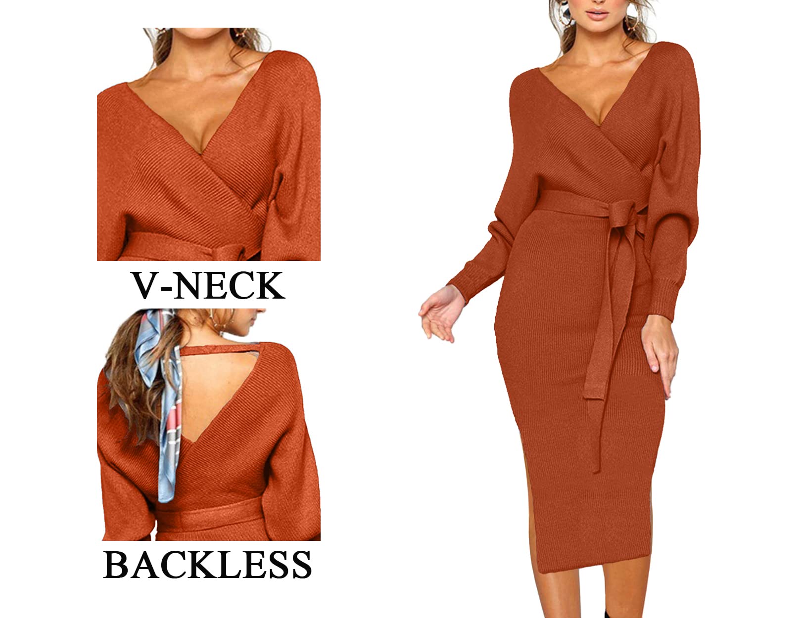 CHERFLY Women's V Neck Sweater Dresses Batwing Long Sleeve Backless Bodycon Dress with Belt(02 Caramel,Medium)