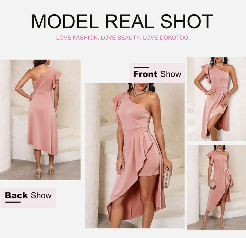 Details: With its one shoulder, ruffle detail, empire waist, and asymmetrical high-low layer, this dress is designed for wedding guest, party, club, cocktail and so on. With soft and stretchy material, it offers nice fit that flatters your curves and great comfort.