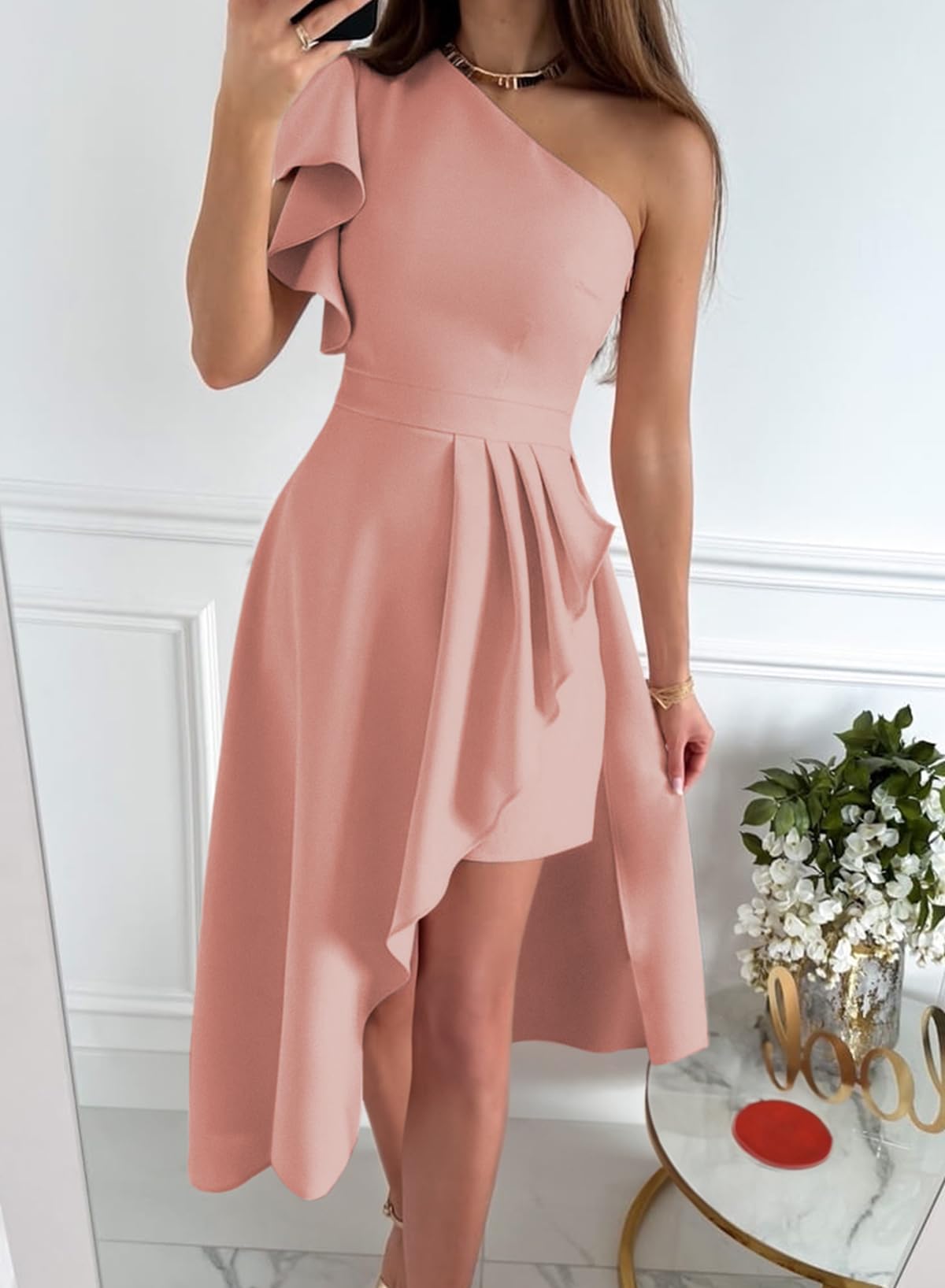 • One shoulder dress with sleeveless, ruffle detail, empire waist, side zipper closure, asymmetrical high-low layer and solid color is stylish, elegant and sexy.