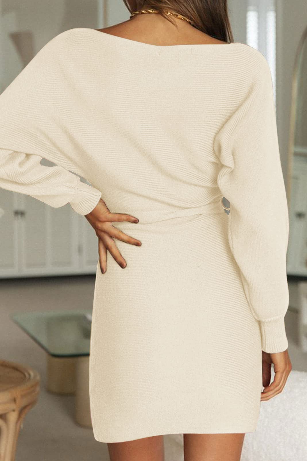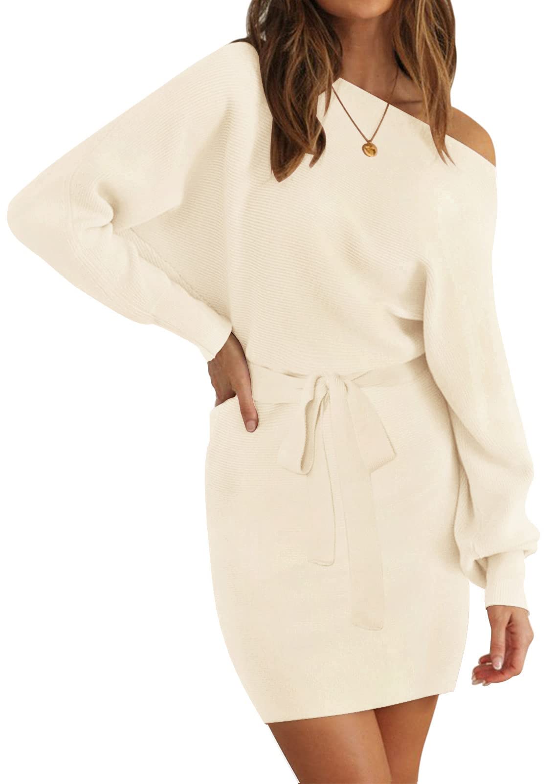 Details: MEROKEETY Women's Off Shoulder Batwing Sleeve Sweater Dress Ribbed Knit Bodycon Mini Dresses with Belt