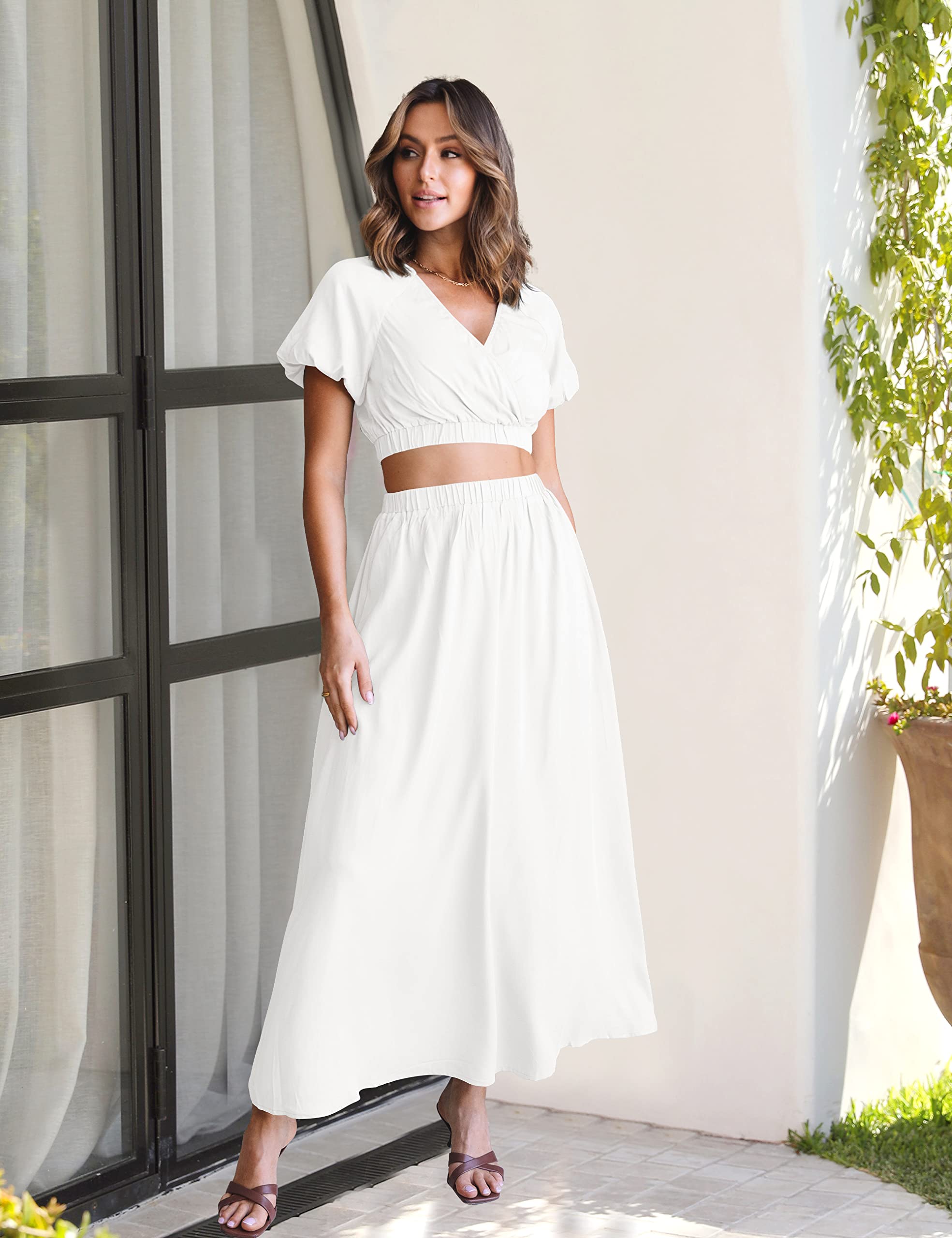MEROKEETY Women's Summer Two Piece Outfits V Neck Puff Sleeve Crop Top and Flowy Maxi Skirt Set,White,M