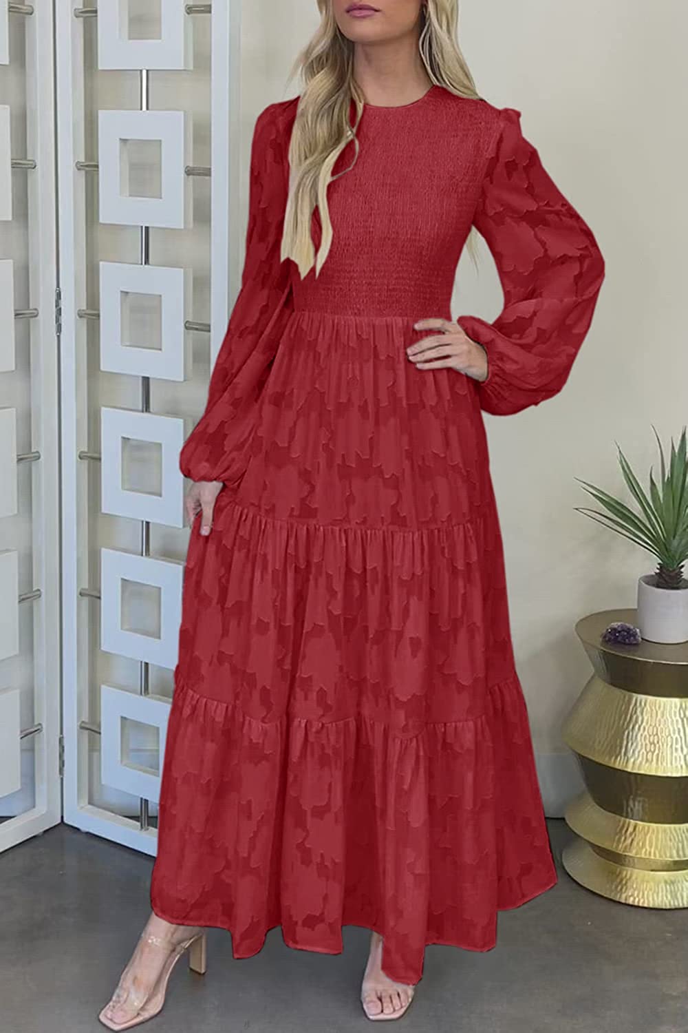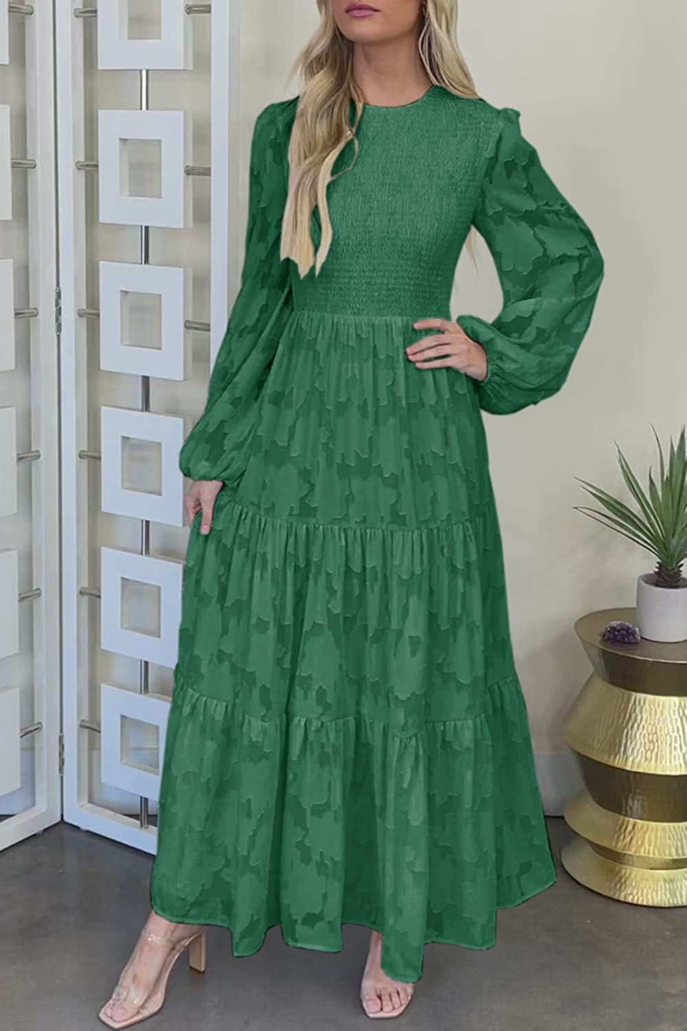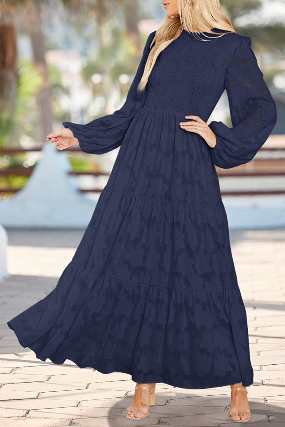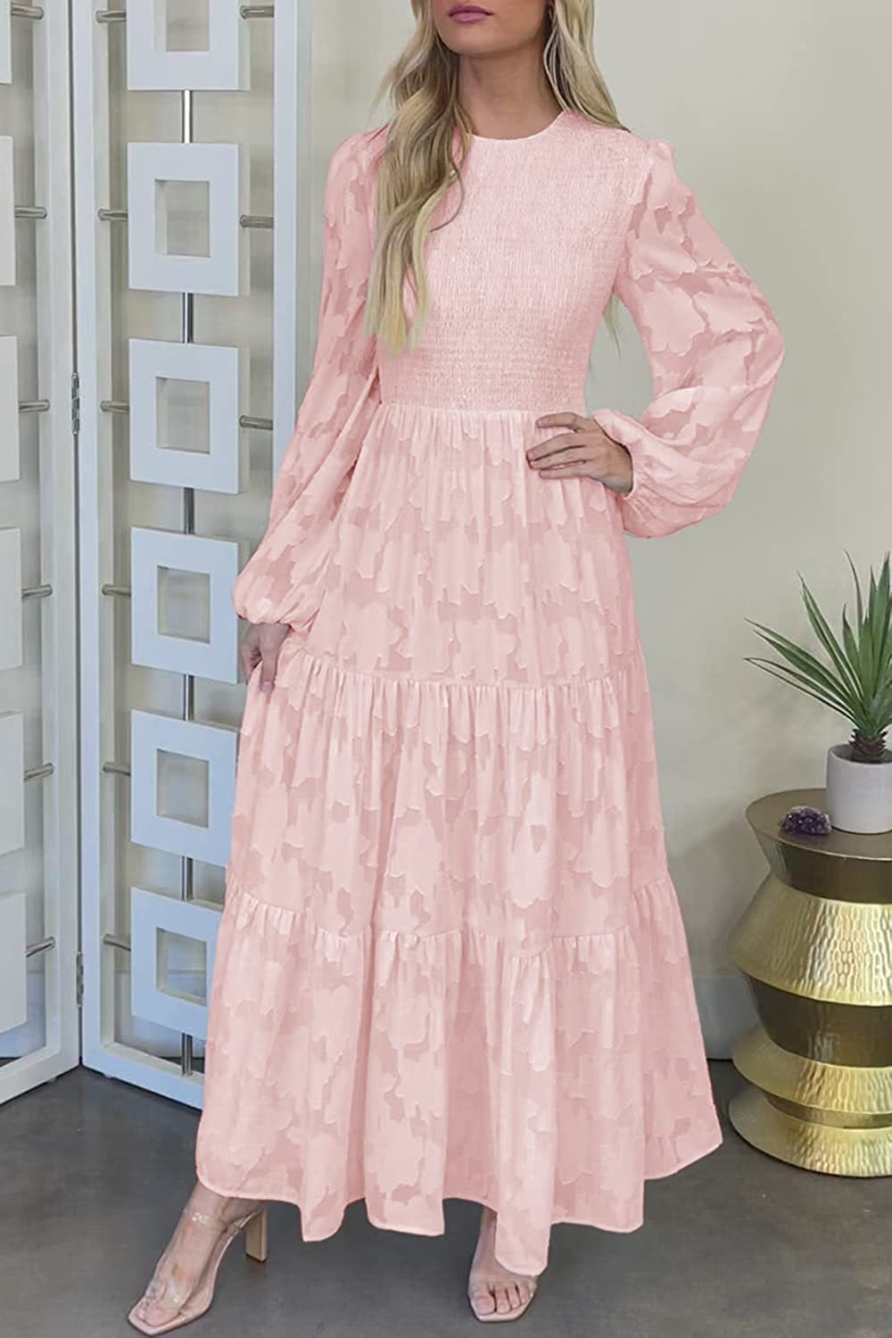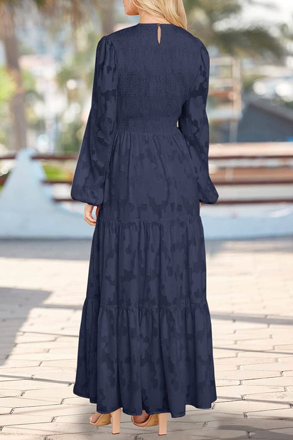 MITILLY Women's Elegant Floral Long Sleeve Round Neck Smocked A-Line Flowy Tiered Maxi Dress with Pockets