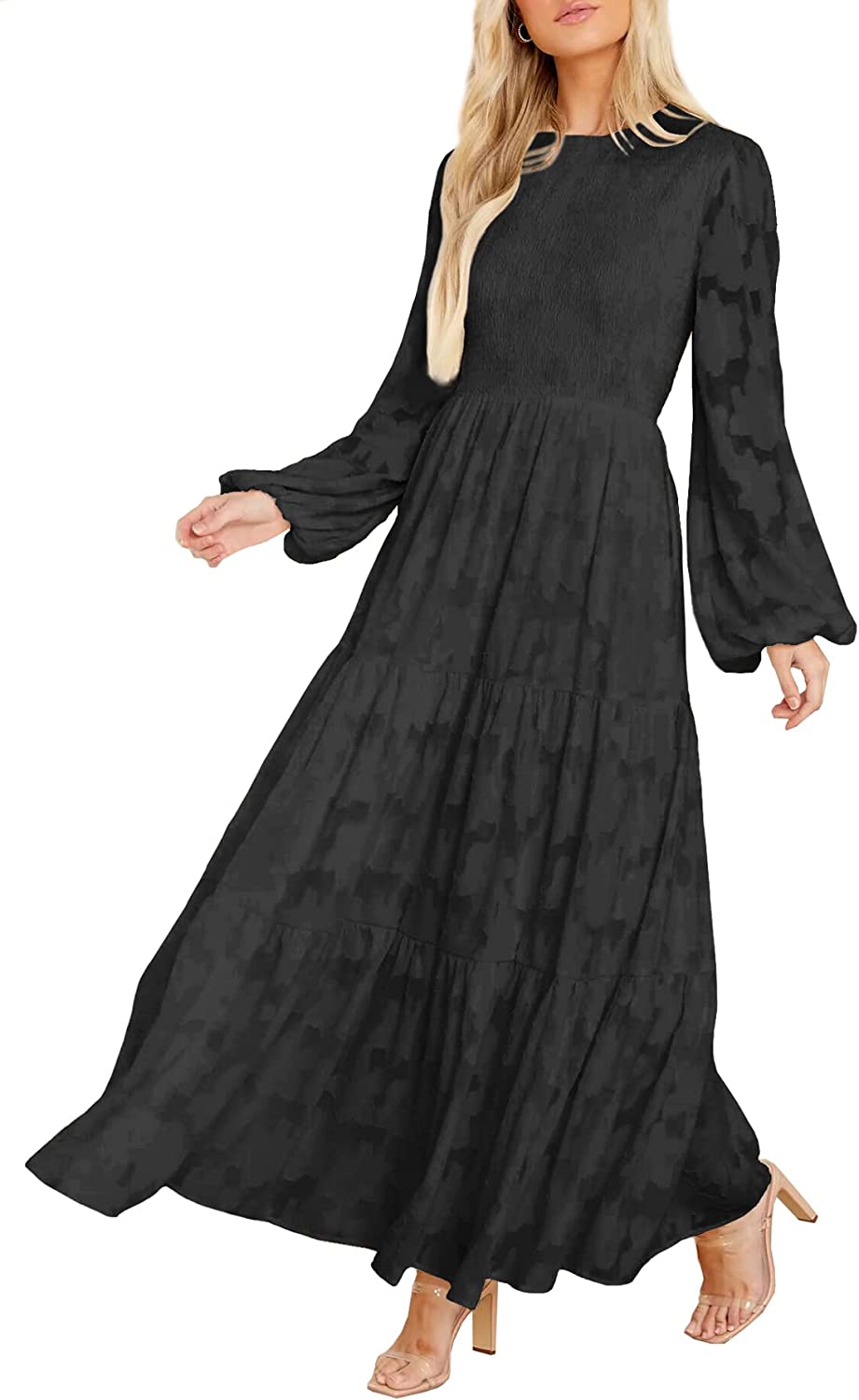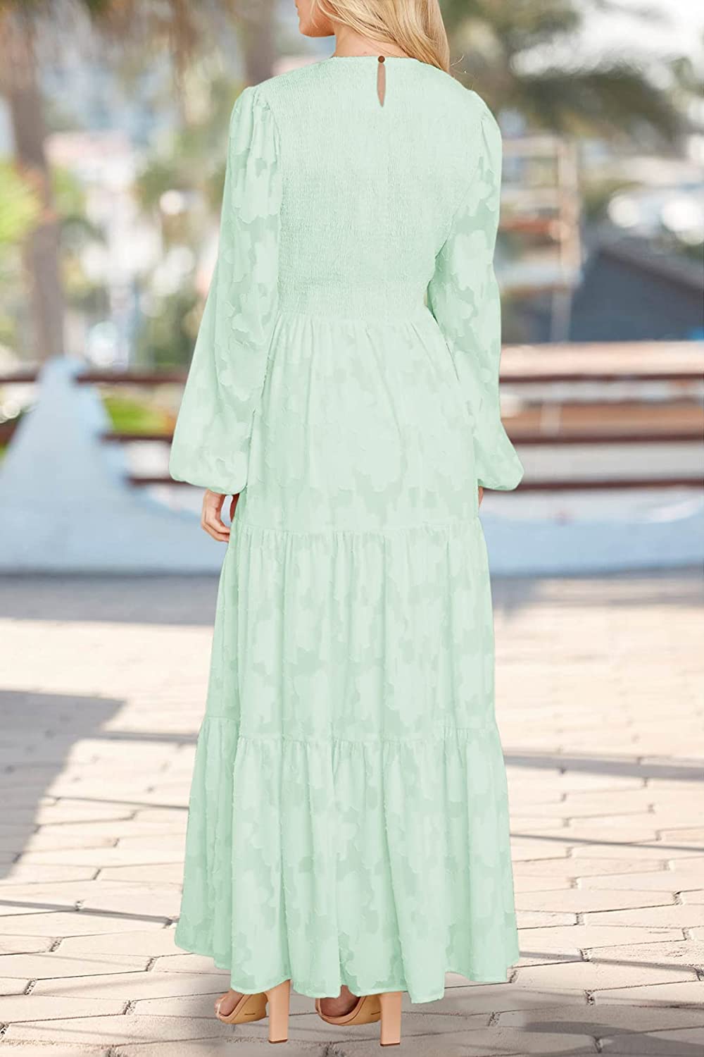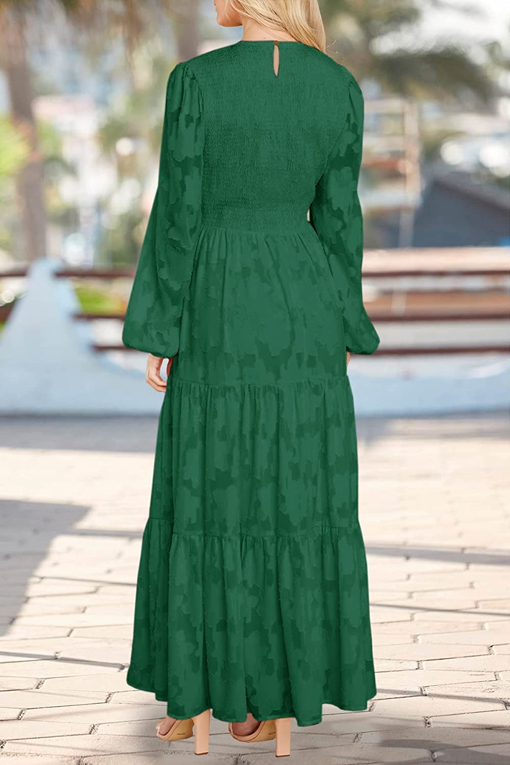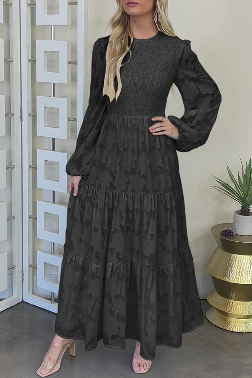 MITILLY Women's Elegant Floral Long Sleeve Round Neck Smocked A-Line Flowy Tiered Maxi Dress with Pockets
