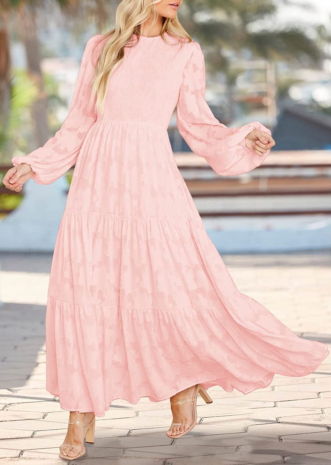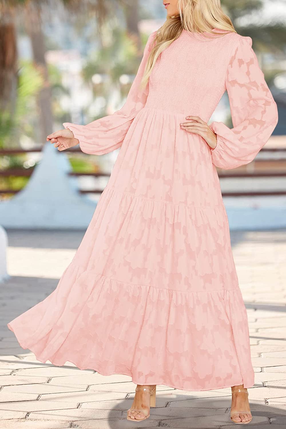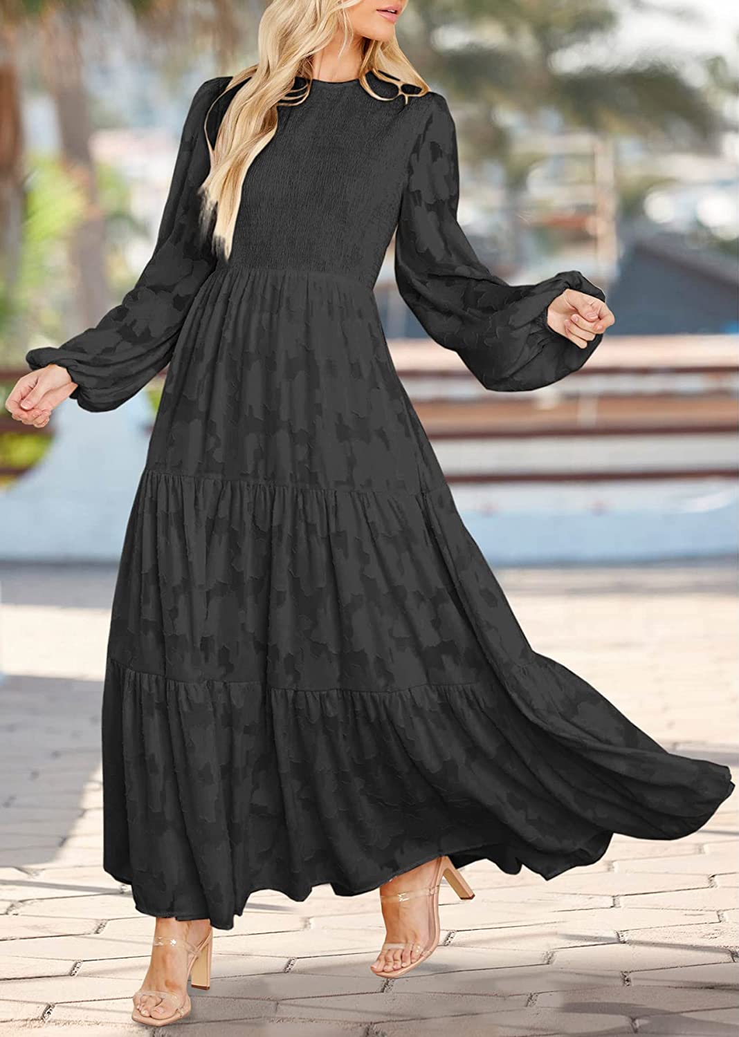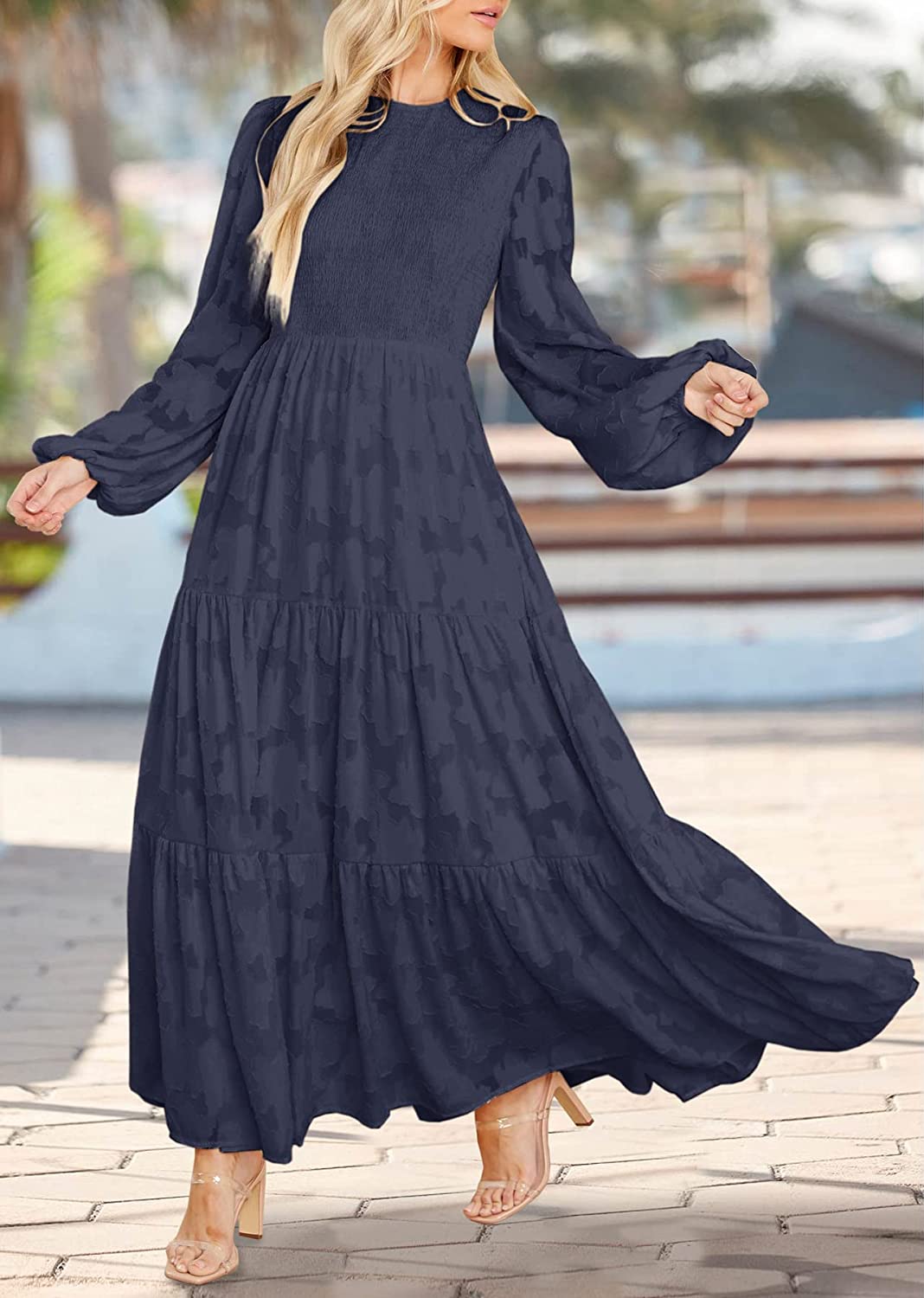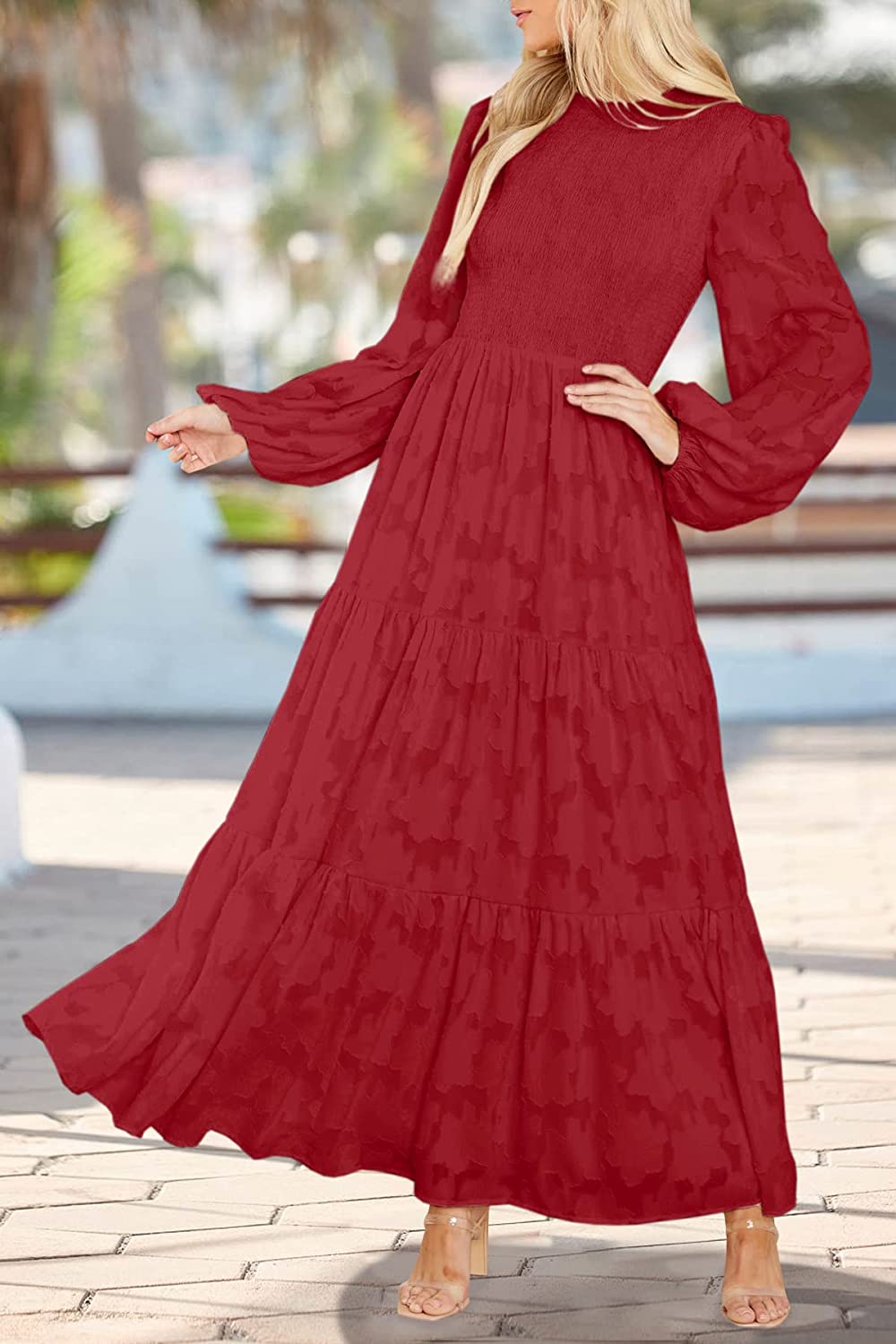 MITILLY Women's Elegant Floral Long Sleeve Round Neck Smocked A-Line Flowy Tiered Maxi Dress with Pockets