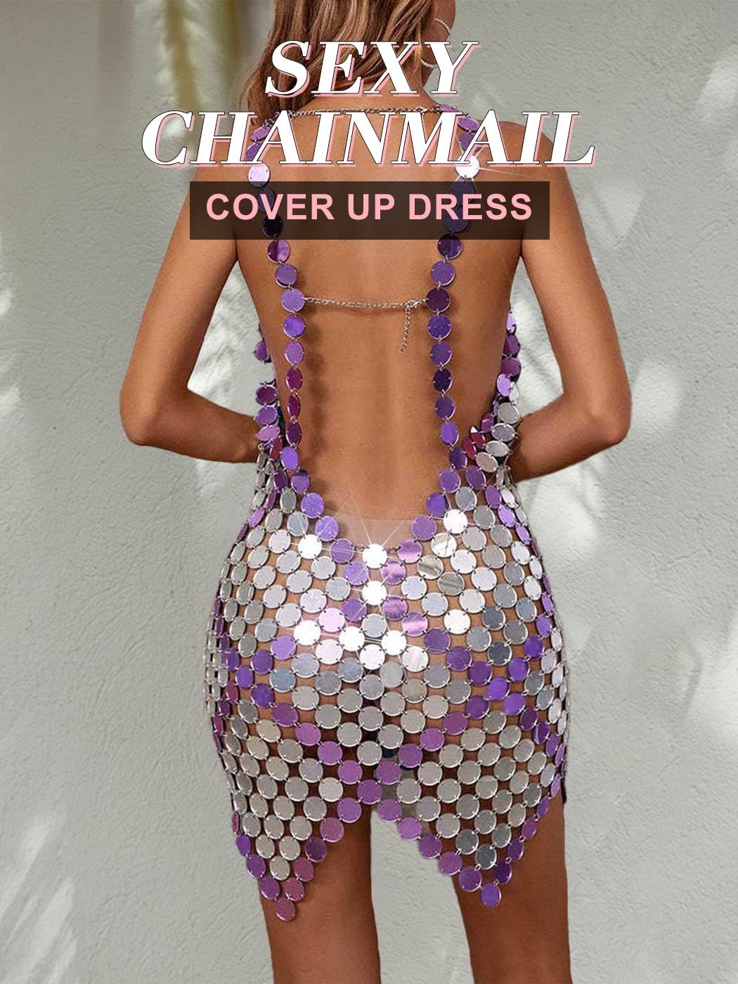 Nicute Dot Sequin Dress Sparkly V Neck Disco Sleeveless Chainmail Dress Hollow Out Summer Bikini Dresses for Women Silver
