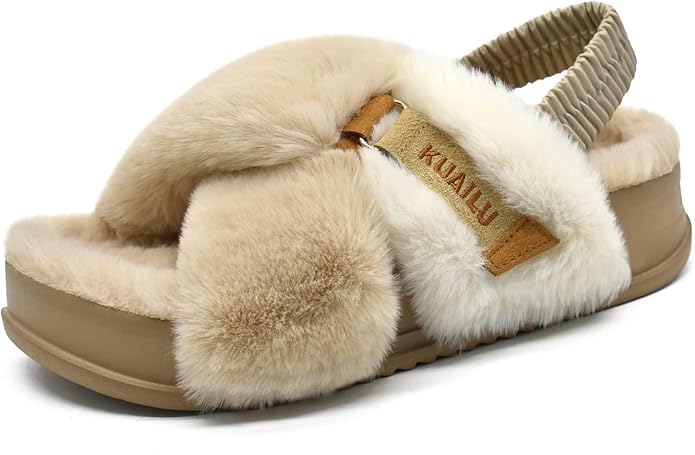 KuaiLu Womens Fuzzy Cross Band Platform Slippers with Back Strap Arch Support Furry Faux Fur Ladies Open Toe Slingback Slide Slippers Cozy Soft Plush Fleece Comfy House Shoe Sandals for Indoor Outdoor