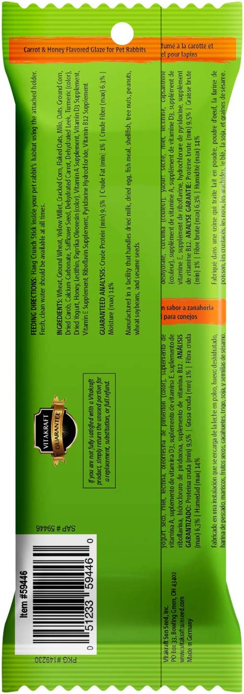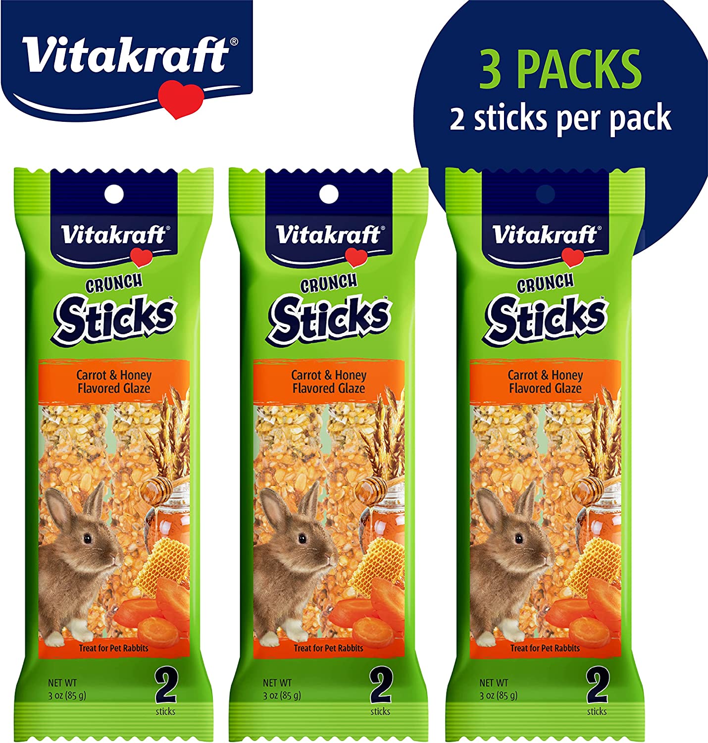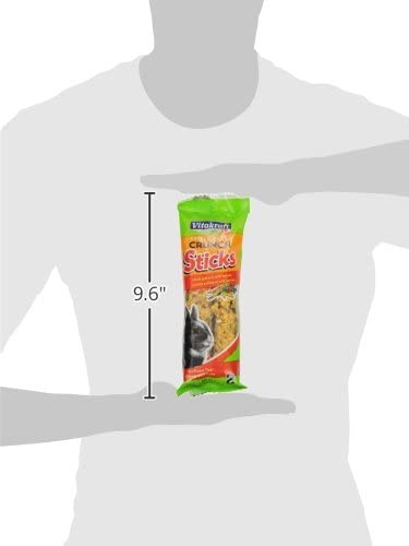 Vitakraft Crunch Sticks are premium small animal treats and bunny chew toys that are as delicious as they are fun. Each Crunch Stick is baked three times on an all-natural wooden stick, giving your small pet hours of chewing fun that supports dental health for their always-growing teeth. These rabbit snacks simulate the instinctive urge to forage for food, making your tiny friend feel like it's in its natural habitat. With its added vitamins and minerals, our Crunch Sticks are a great supplement to rabbit food.