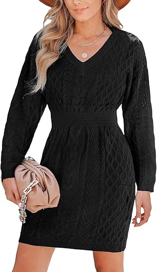 CUPSHE Women Sweater Dress Long Sleeve V Neck Cable Knit Chunky Pullover Short Sweater Dressing