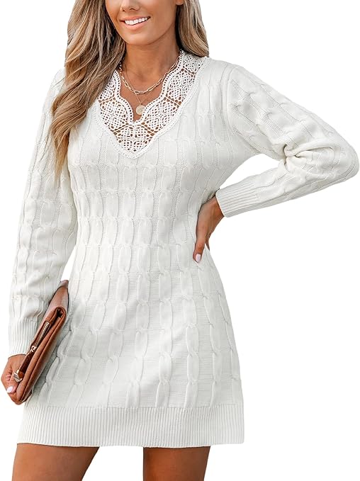 CUPSHE Women's Sweater Dress Lace V Neck Cable Knit Long Sleeve Fitted Casual Pullover Dresses