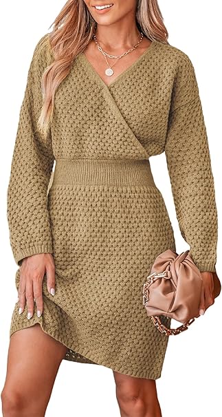 CUPSHE Women's Sweater Dress V Neck Honeycomb Knit Ribbed Long Sleeve Pullover Dress Dark Grey