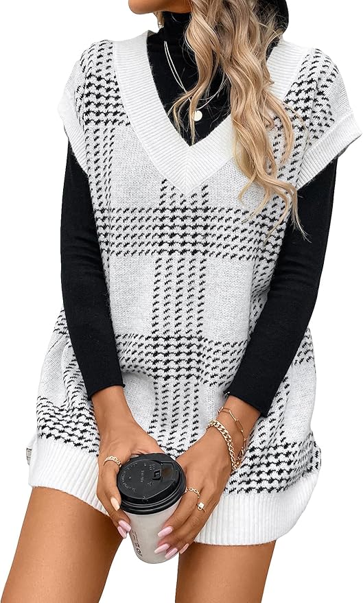 GORGLITTER Women's Oversized Sweater Vest Dress Trendy Plaid V Neck Loose Knit Top Fall Fashion 2024