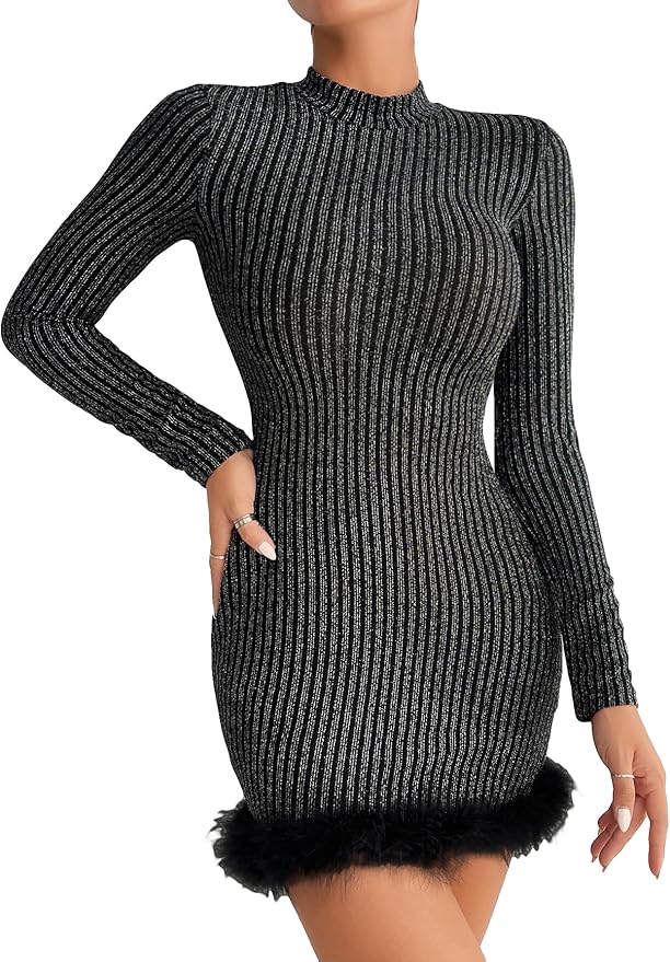 Milumia Women's Fuzzy Hem Rib Knit Long Sleeve Bodycon Dress Mock Neck Mini Sweater Dresses