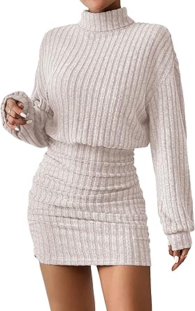 WDIRARA Women's Turtleneck Ribbed Knit Long Sleeve Drop Shoulder Bodycon Mini Sweater Dress