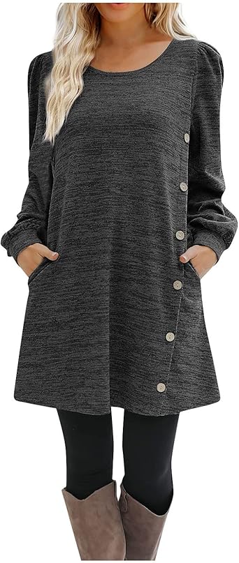 Women's Button Side Long Sleeve Dresses 2024 Fall Fashion Sweater Dresses Casual Crew Neck Pullover Tops with Pockets