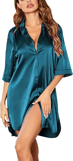 Ekouaer Women's Satin Nightshirt Button Down Sleepshirt Silk 3/4 Sleeve Nightgown Boyfriend Notch Collar Sleepwear S-3XL