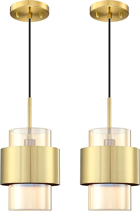 2 Pack 1 Light Hanging Indoor Kitchen Island 6" Drum Clear Amber Glass Shade Pendant Ceiling Light Fixtures, Brushed Bronze Finish Modern Farmhouse Dinning Over Sink