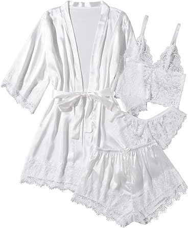 WDIRARA Women' Silk Satin Pajamas Set 4pcs Lingerie Floral Lace Cami Sleepwear with Robe