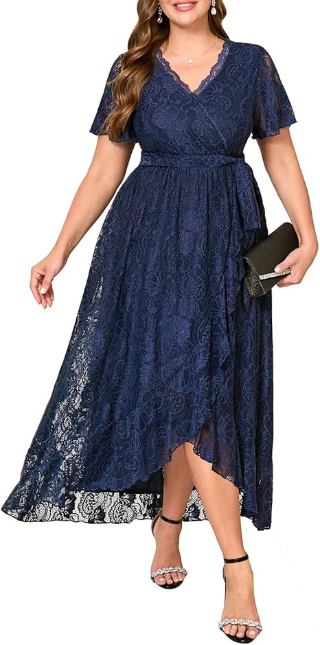 Plus Size Dresses Wedding Guest - Formal Cocktail Party Lace Wrap V Neck High Low Long Dress
