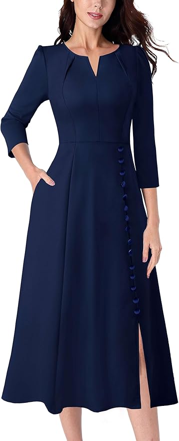VFSHOW Womens Pleated Notch Neck Front Slit Buttons Pockets Office Business Work Slim Fit A-line Fit and Flare Midi Dress