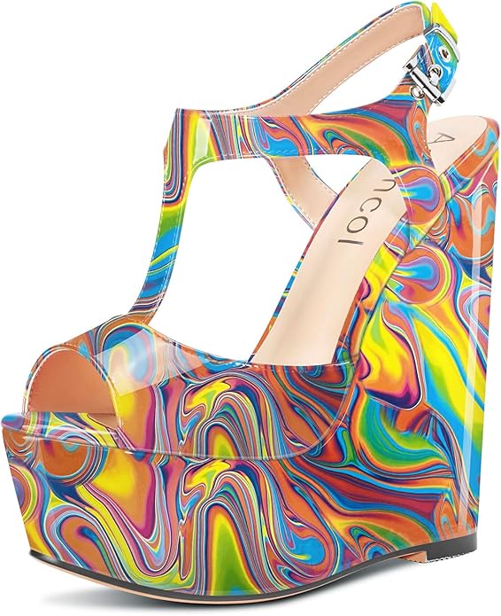 Aachcol Women Platform Wedge Sandals Peep Toe T-strap Ankle Strap Slingback Wedge High Heel Dress Shoes Patent 6 Inch