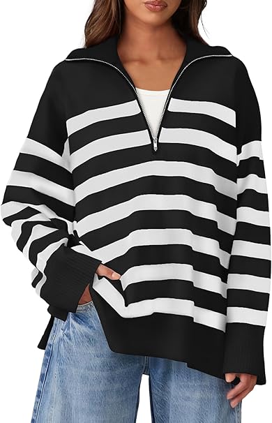 WIHOLL Womens Sweaters Long Sleeve Casual Half Zip Lapel Collar Stripe Pullover Tops Side Slit Sweaters Fashion Clothes