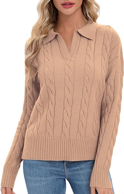 Urban CoCo Womens Cable Knit Sweaters Long Sleeve V Neck Pullover Polo Sweater Tops 2024 Winter Trendy Outfits