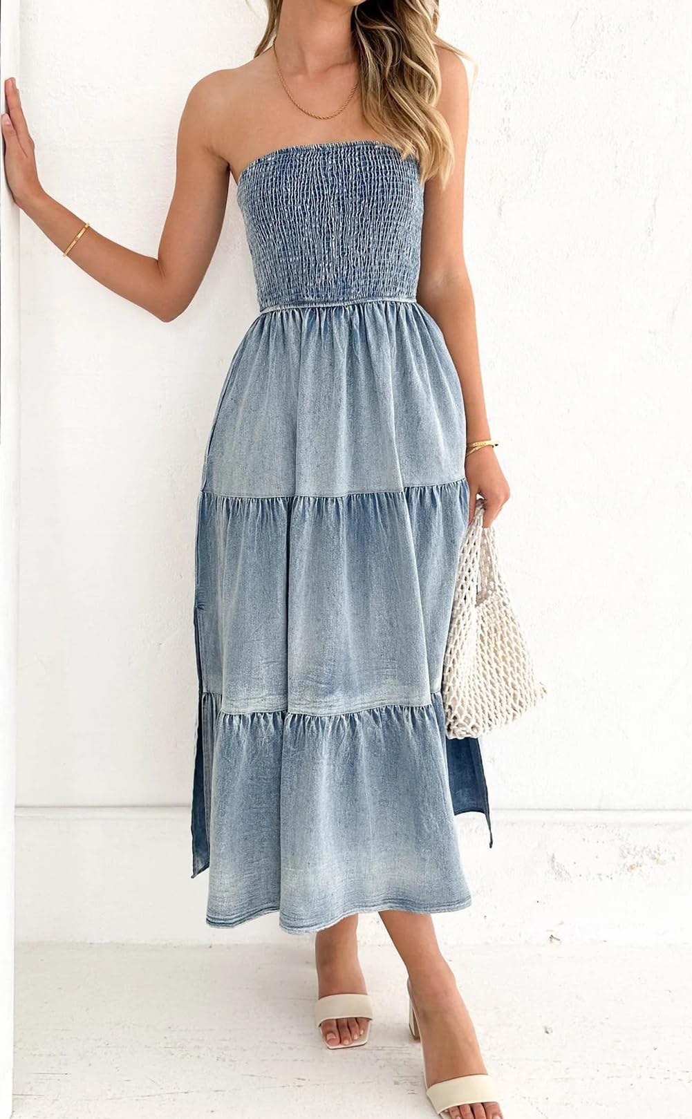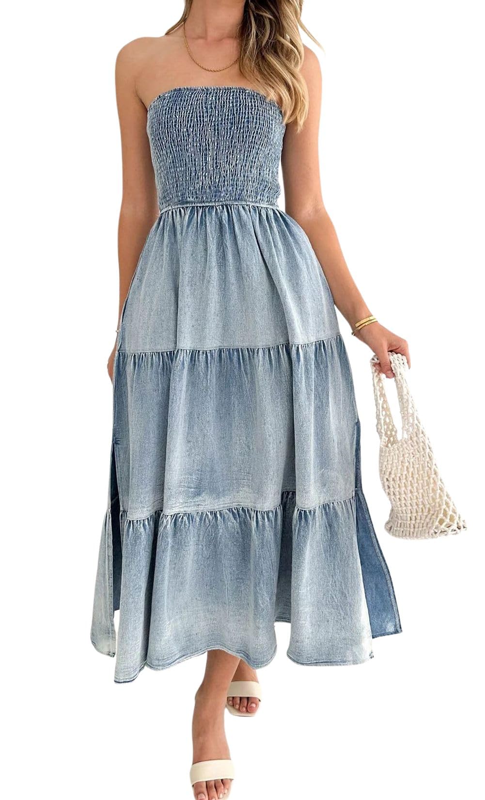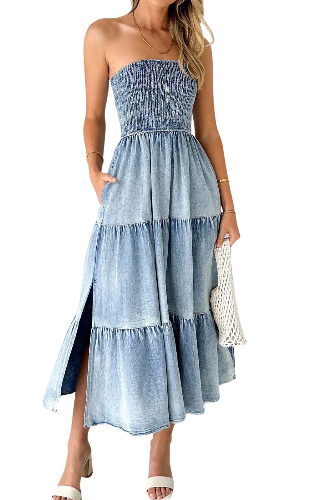 • 【SELLING POINTS for STRAPLESS DRESS】----- Stretchy smocked dress/ Strapless sundress/ Bohemian style/ Tube top dress/ High waisted/ A line maxi dress/ Ruffle tiered dress with side slit/ Gradient denim dress/ Low back backless dress/ Solid color- blue jean denim dress