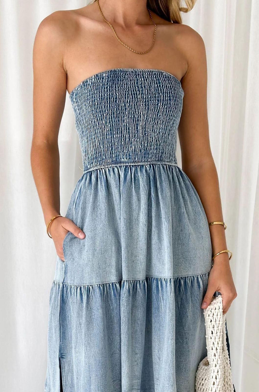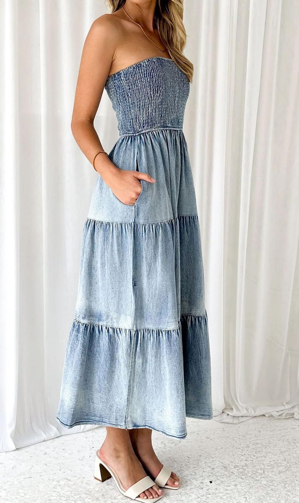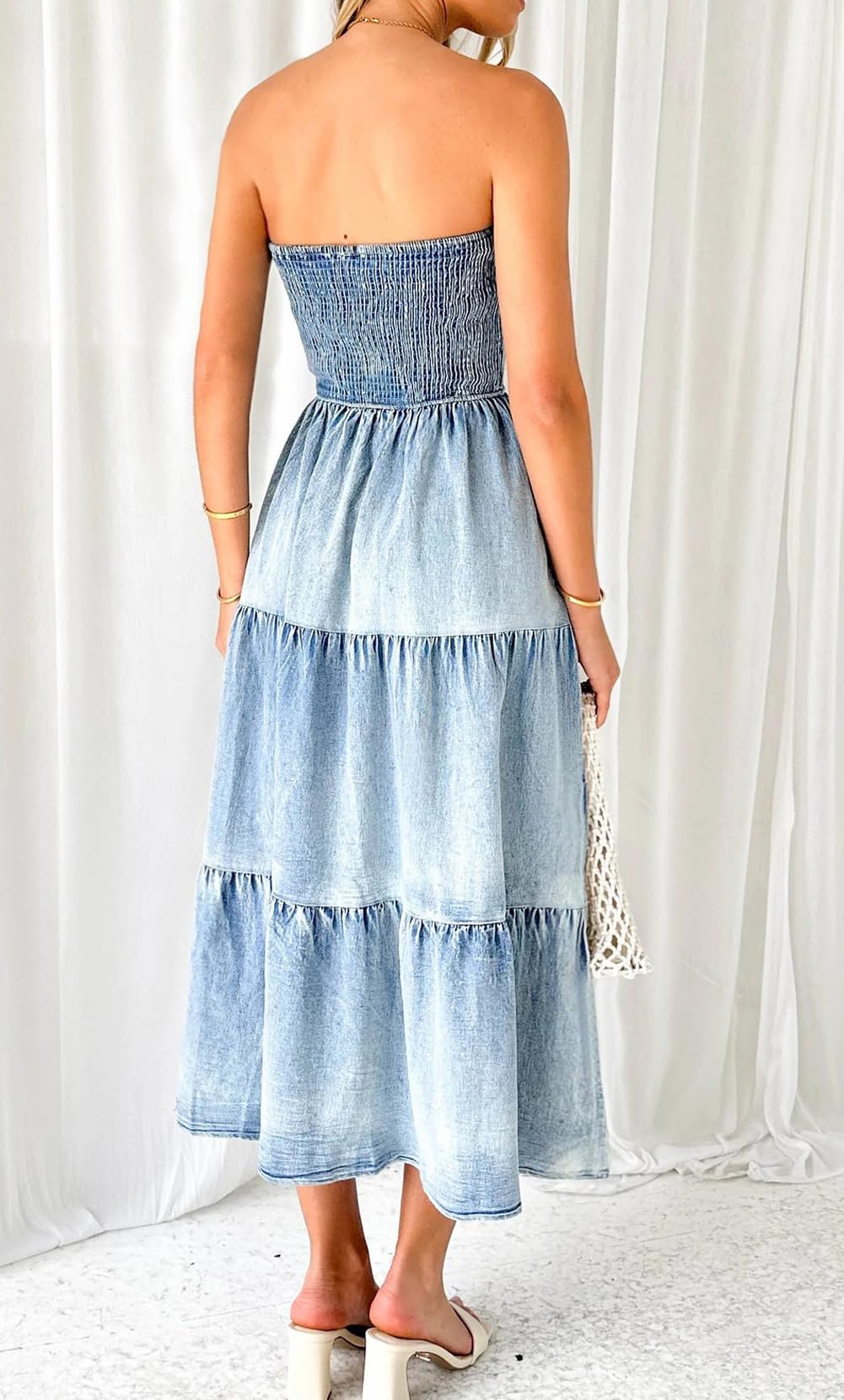 • 【SELLING POINTS for STRAPLESS DRESS】----- Stretchy smocked dress/ Strapless sundress/ Bohemian style/ Tube top dress/ High waisted/ A line maxi dress/ Ruffle tiered dress with side slit/ Gradient denim dress/ Low back backless dress/ Solid color- blue jean denim dress