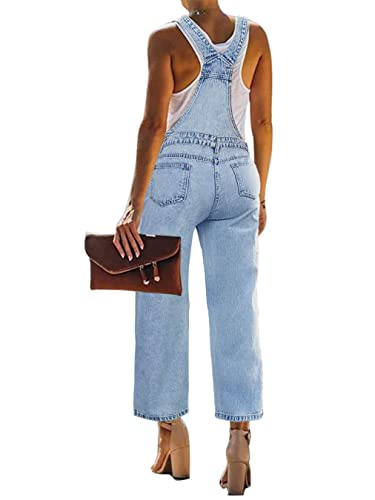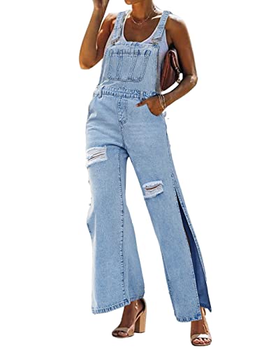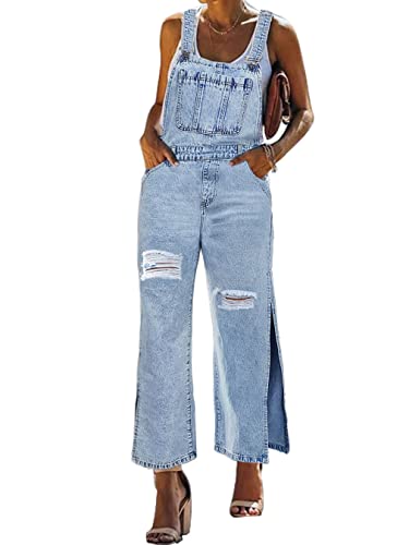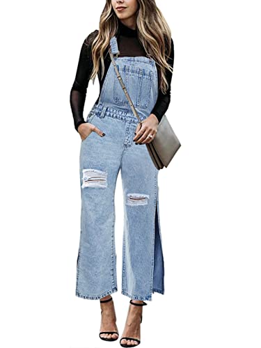 CHARTOU Women's Classic Adjustable Straps Ripped Denim Slit Wide Leg Bib Overalls Jeans Pants (Medium, Light Blue)