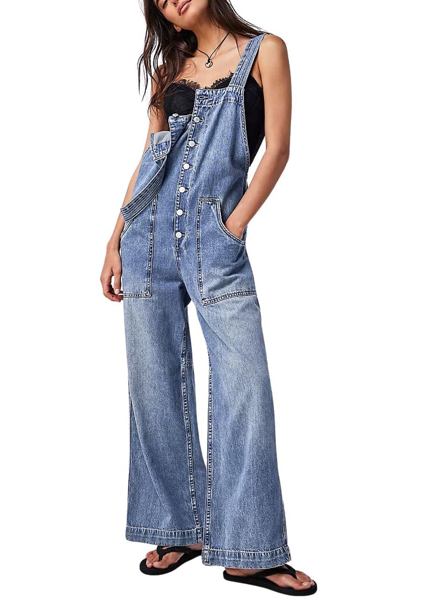 chouyatou Women's Summer Casual Adjustable Strap Denim Jumpsuit Loose Fit Wide Leg Stretch Bib Jean Overalls (Medium, Light Blue)