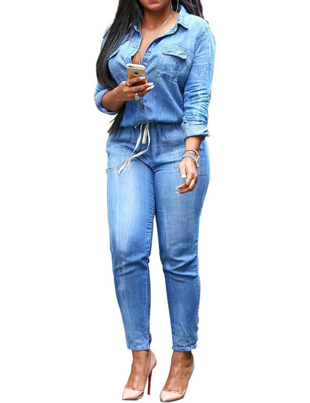 • Long Sleeve,Full Length,Solid Jean Blue,Lapel,Sexy Button Dowm Front Jacket Jumpsuit with Drawstring Waist and Pockets.Slim Fit