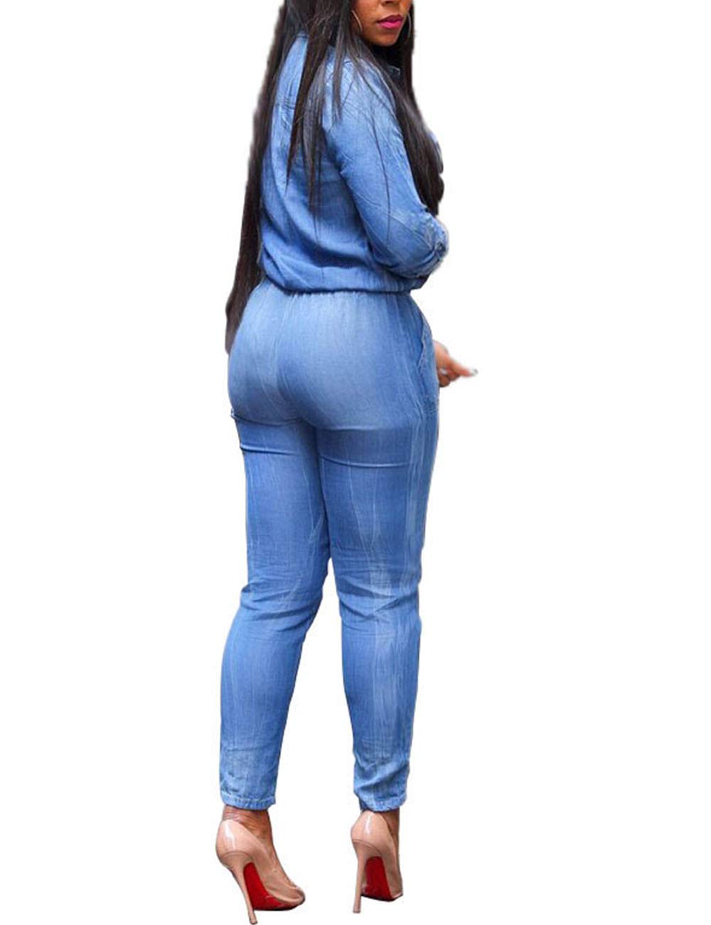 • Long Sleeve,Full Length,Solid Jean Blue,Lapel,Sexy Button Dowm Front Jacket Jumpsuit with Drawstring Waist and Pockets.Slim Fit