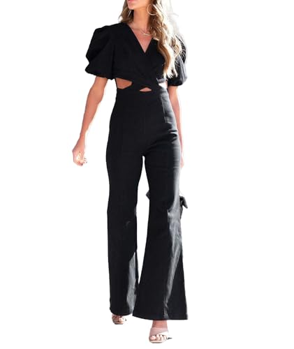 • ★Features☆★Summer Denim Jumpsuit,Short Sleeve,Puff Sleeve,V Neck,Cross Waist,Cutout High Waist,Hollow Out,Back Zipper Closure,Long Wide Leg Flare Jean Pants,Slim Fit,One Piece Jeans Jumpsuit Overalls