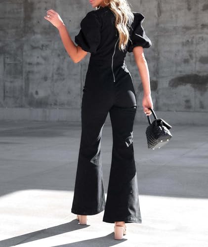 Sexyshine Women's Puff Short Sleeve Cutout Denim Jumpsuit V Neck Zipper Back Flared Wide Leg Full Length Jeans Rompers(26712BL,XL)