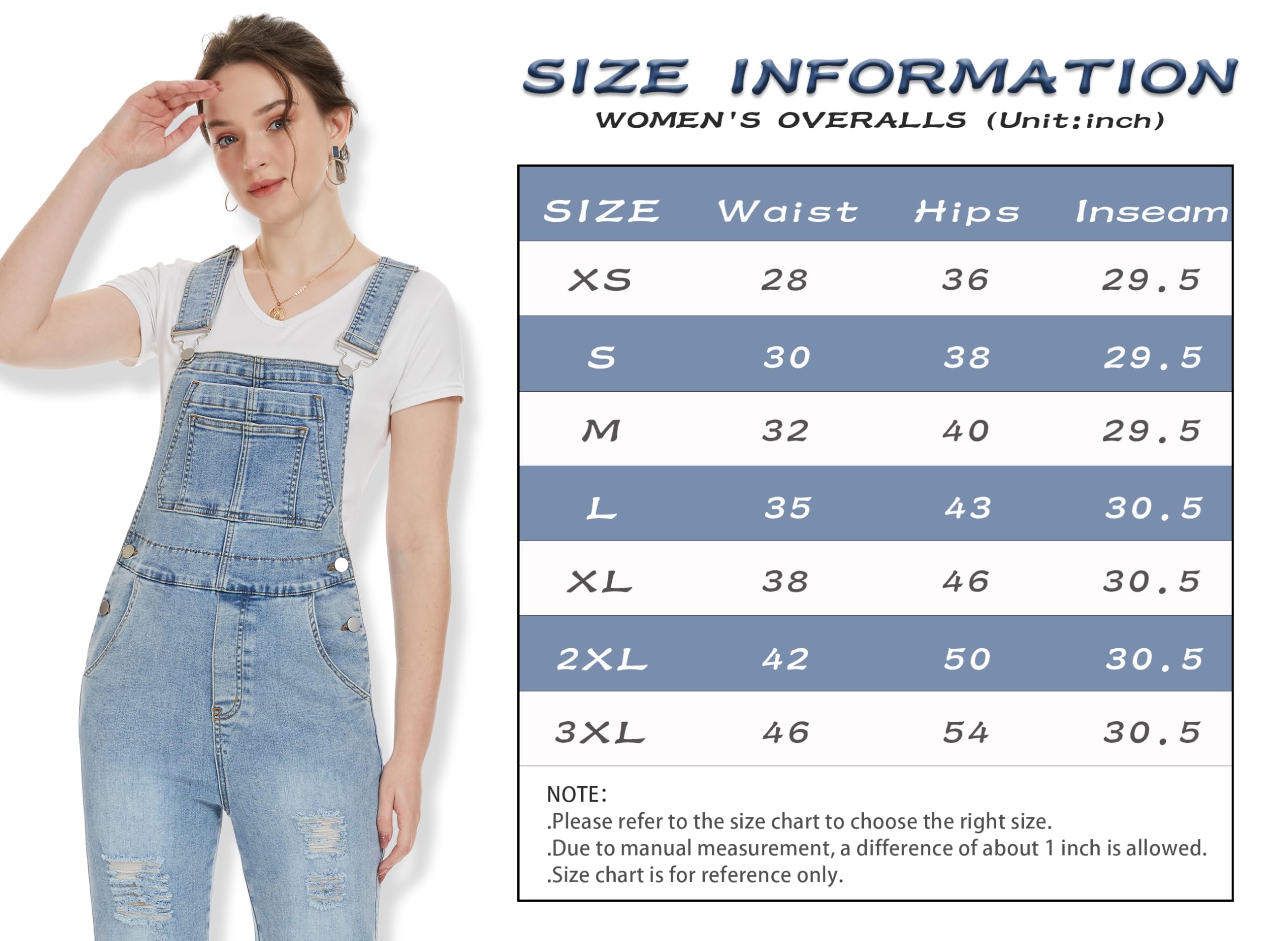 • 【Jean Jumpsuit Size】Womens bib overalls casual are true to US size. Size Small fits size 2 - size4, size Medium fits size6 - size 8, size Large fits size 10 - size 12, size X-Large fits size 14 - size 16, size XX-Large fits size 16 - size 18,size XXX-Large fits size 20. The womens overalls comfy are soft and slightly stretchy. We suggest gentle machine wash or hand wash, do not bleach.