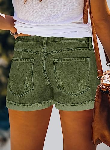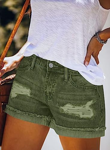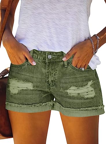 FEKOAFE Shorts for Womens 2024 Summer Mid Waisted Denim Jean Shorts Casual Ripped with Pockets Army Green L