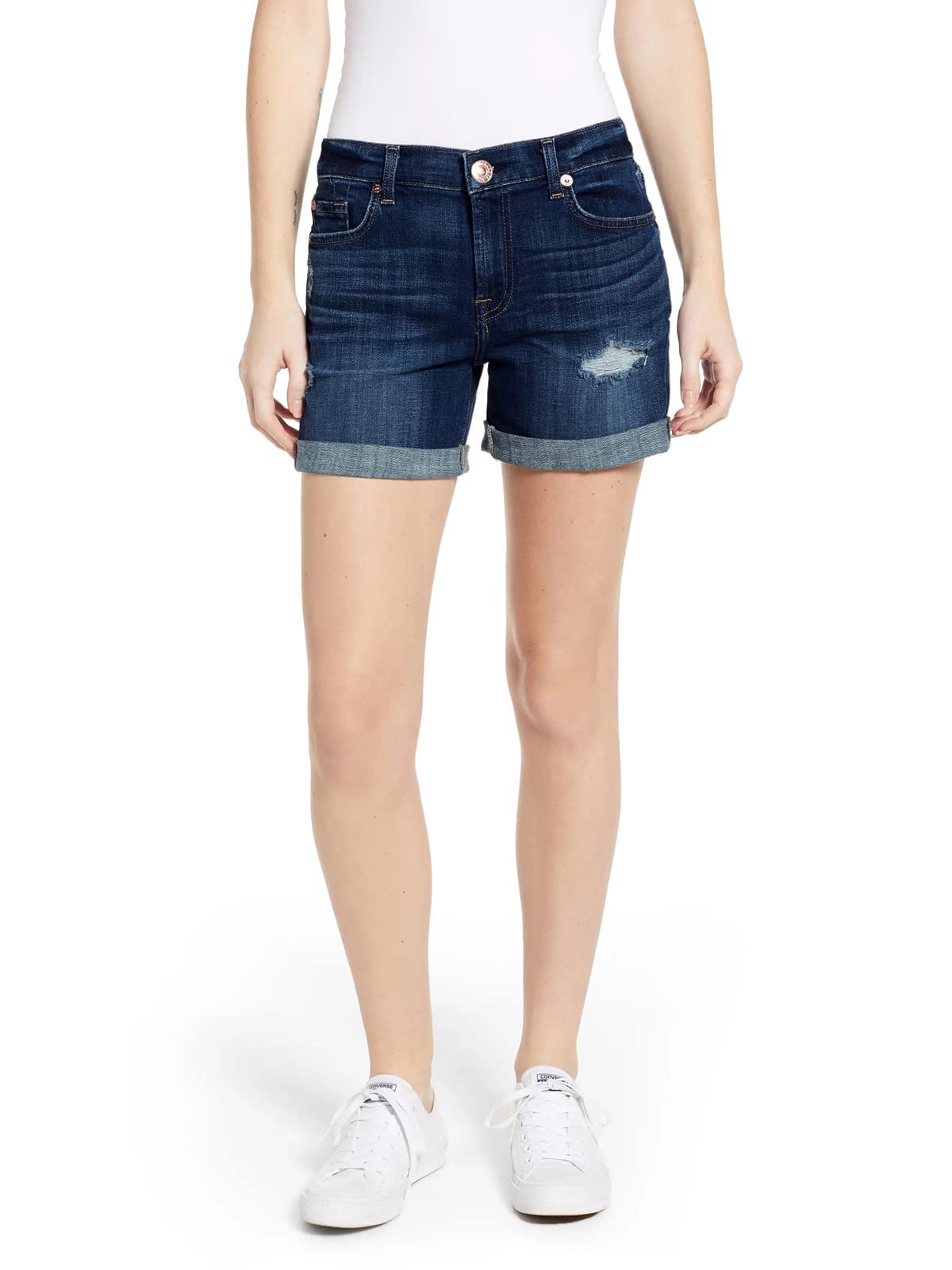 • Material: 95% cotton + 5% spandex.Made of comfort and stretchy denim fabric.Women's mid waisted ripped casual denim shorts with pockets.