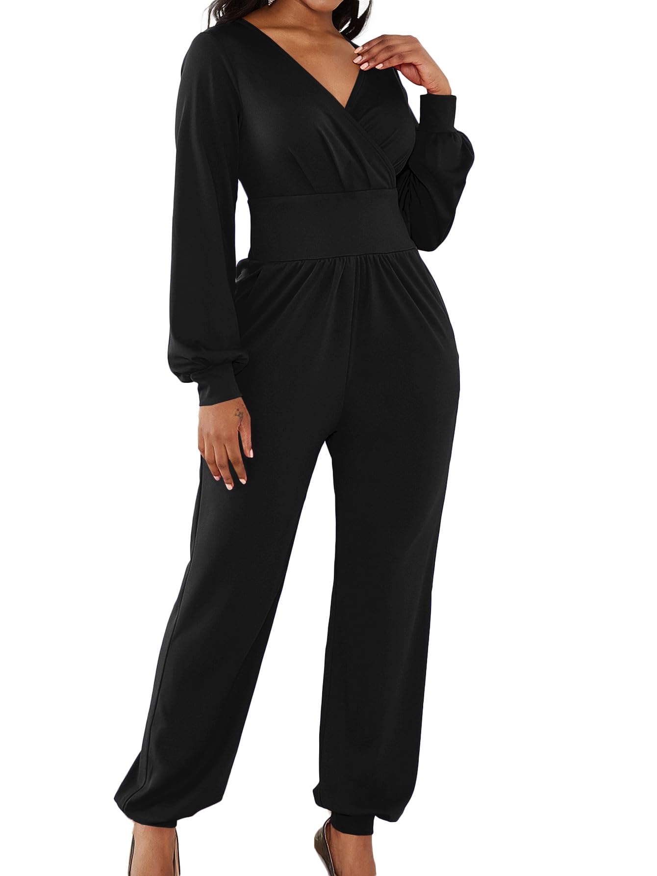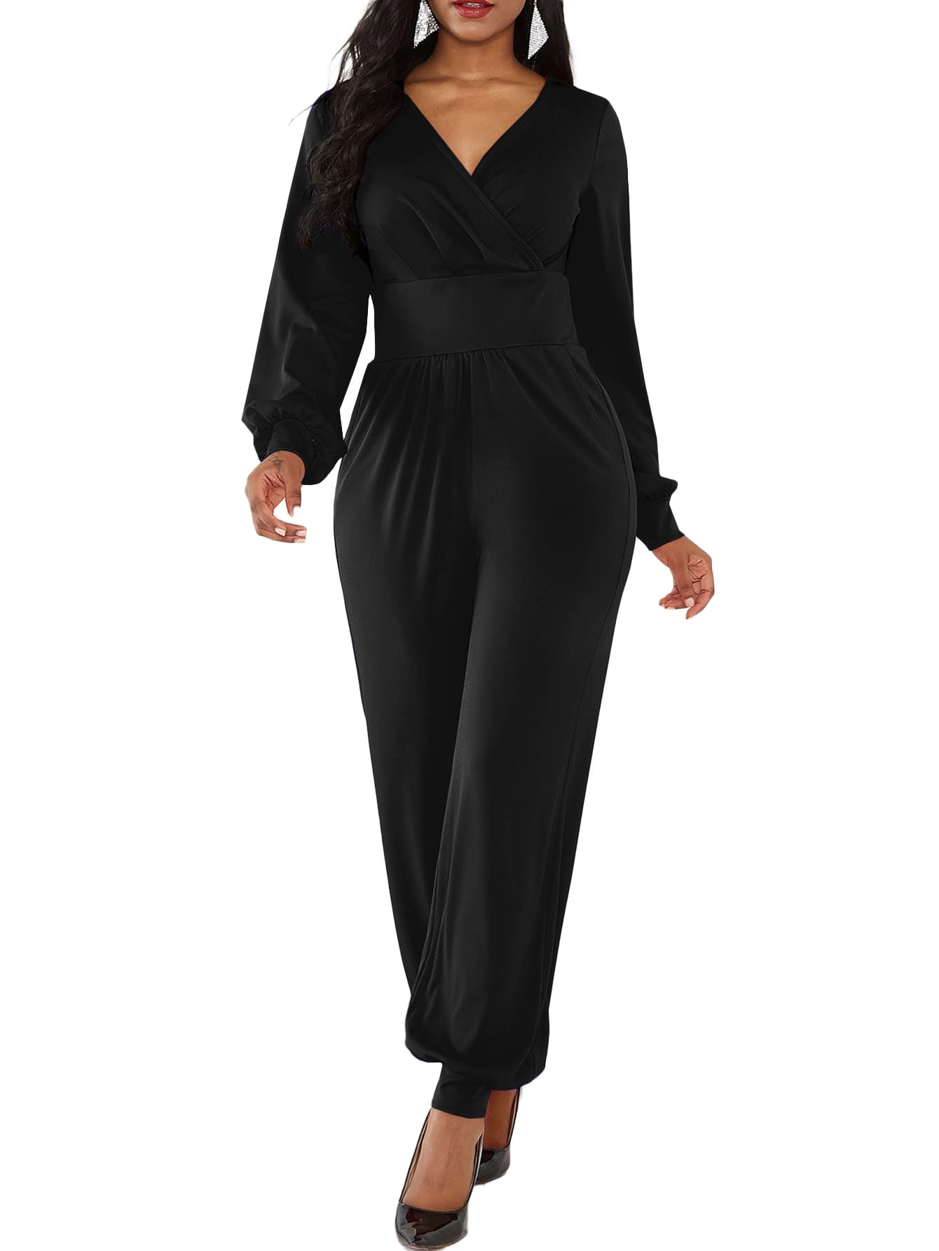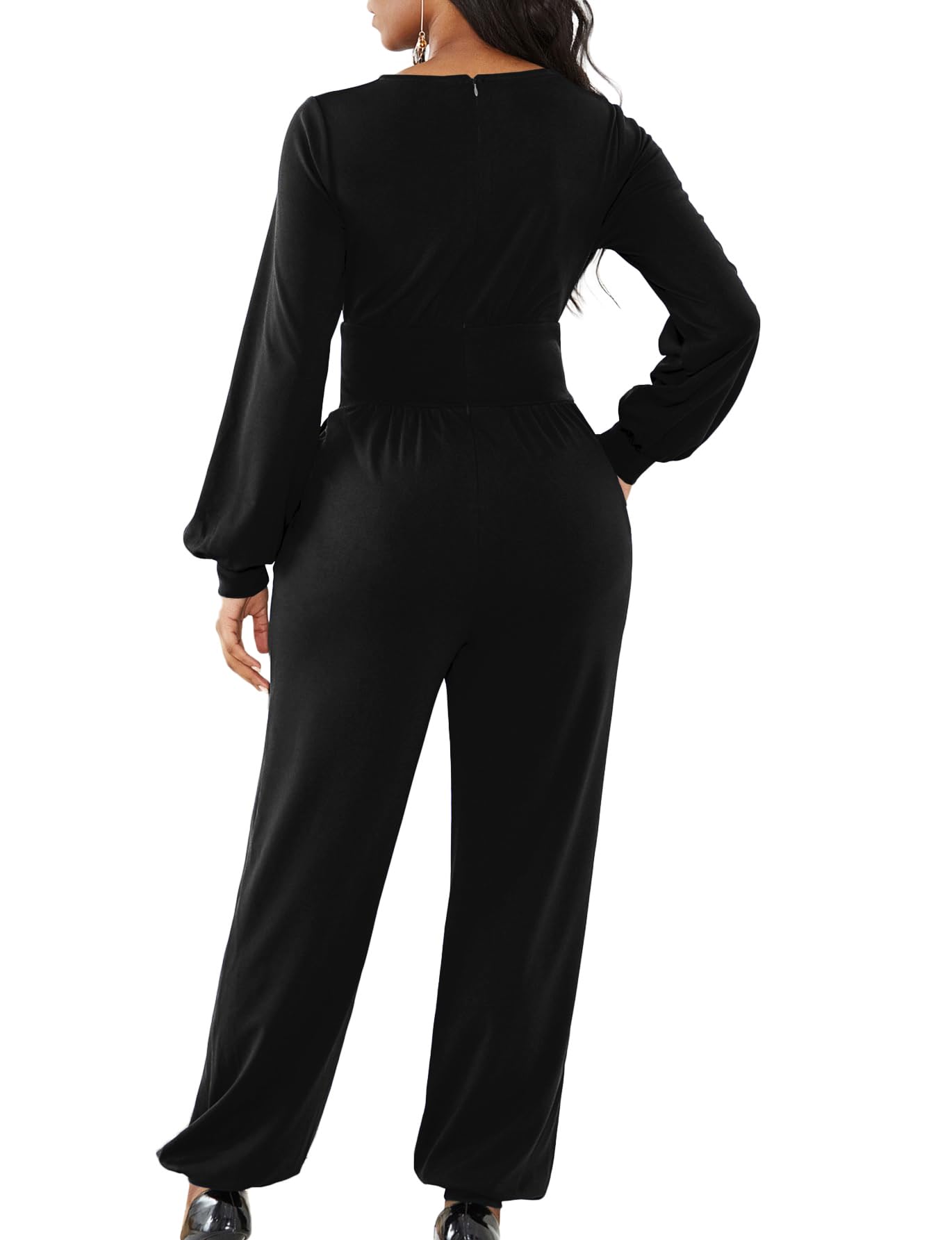 • Wrap v neck long sleeve jumpsuit features with high waist, solid color, lantern long sleeve with elastic cuff, elegant solid color high waisted pockets pants club party cocktail jumpsuits.