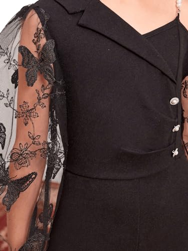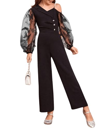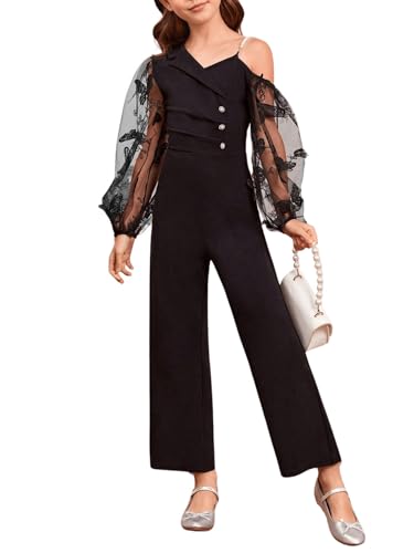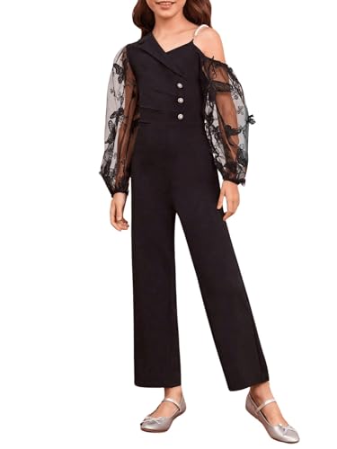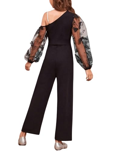 WDIRARA Girl's Contrast Mesh Bishop Long Sleeve Asymmetrical Neck Jumpsuits Long Pants Black 10Y
