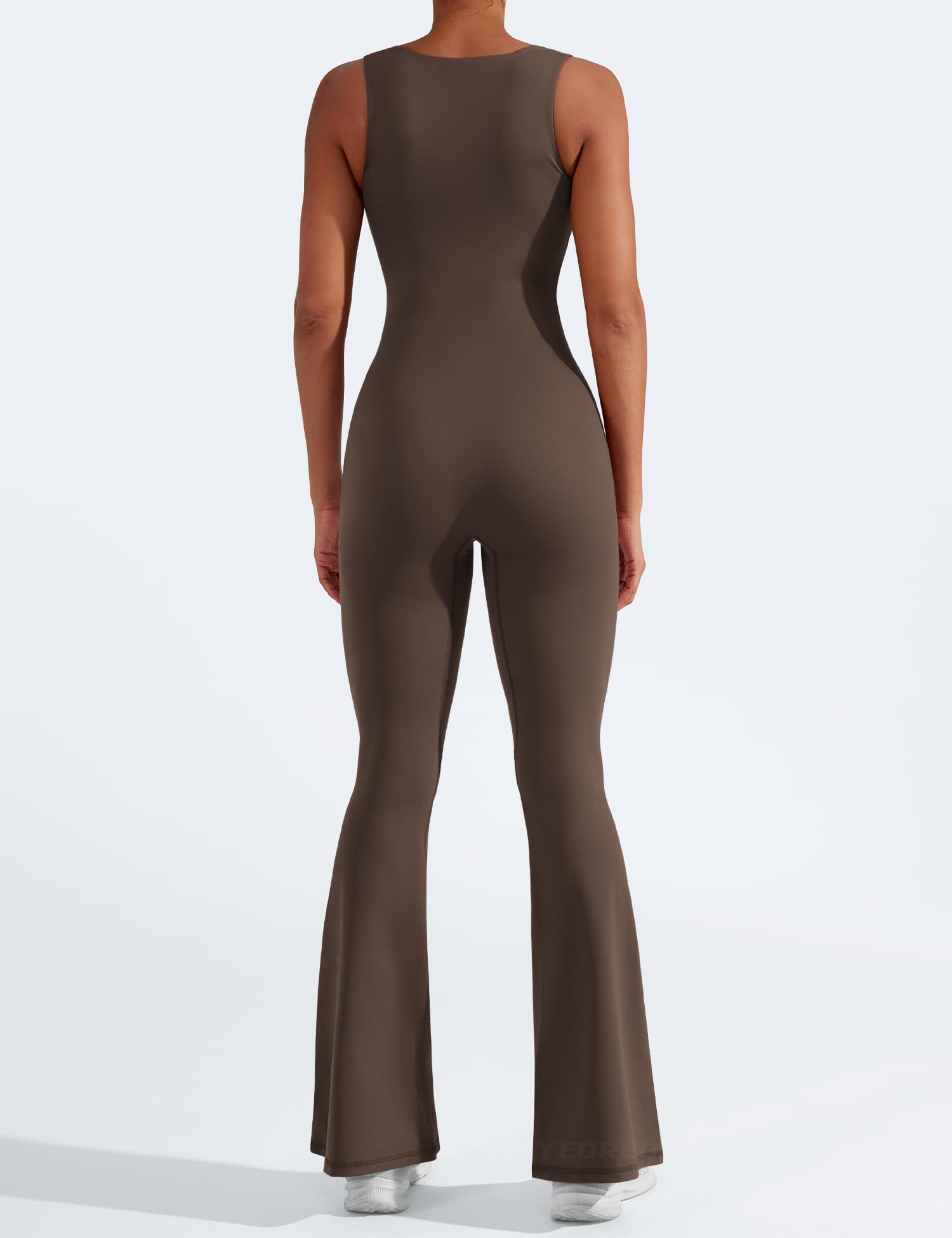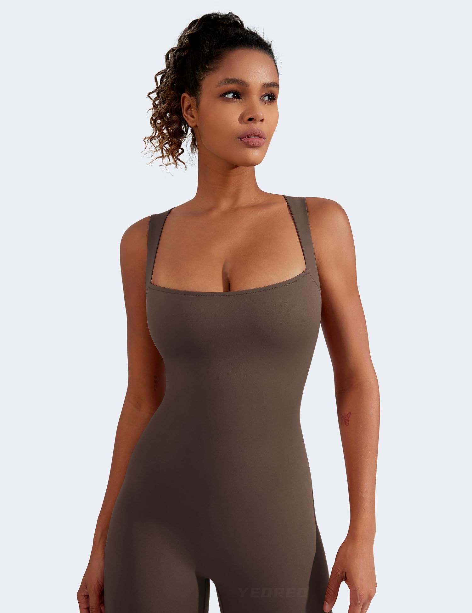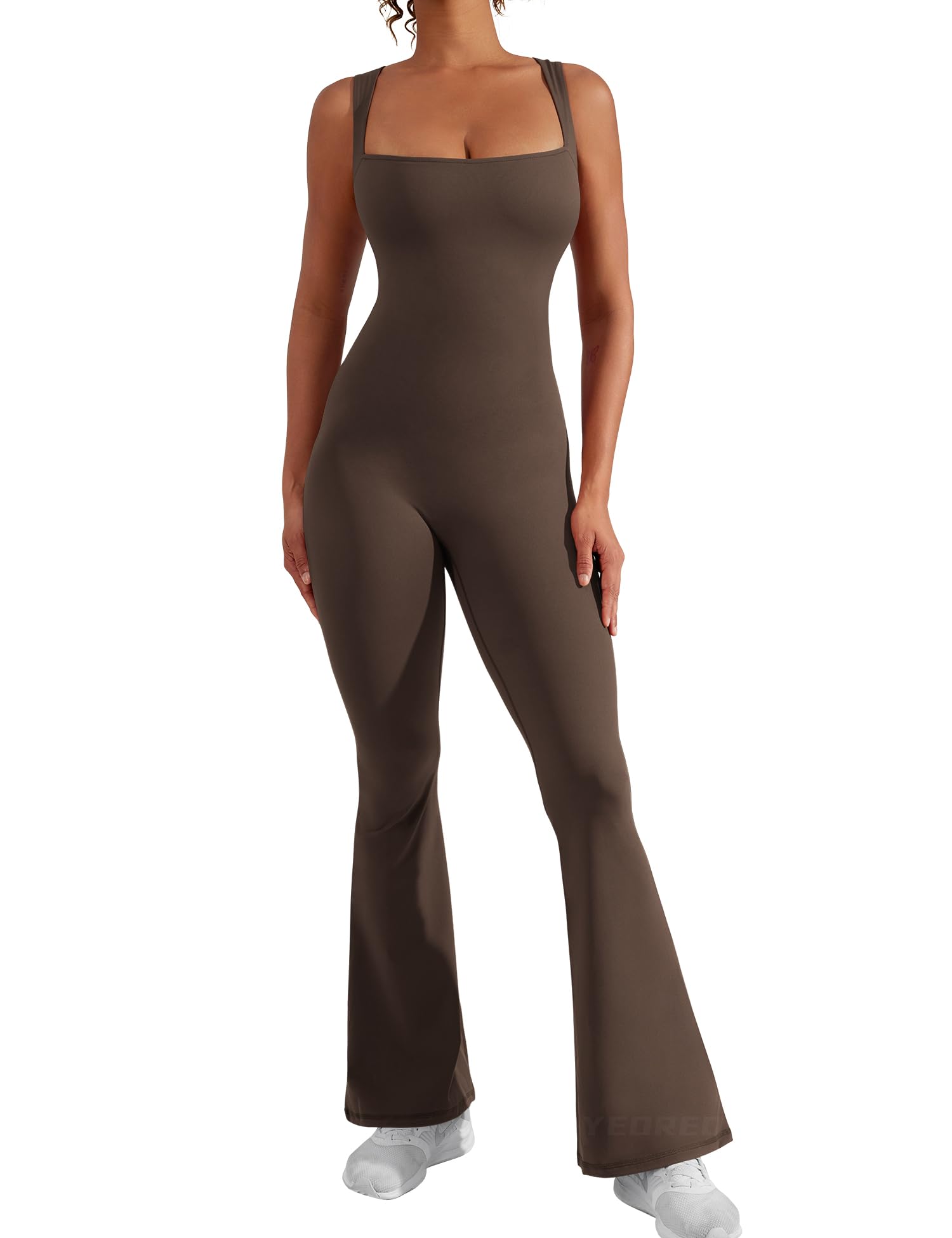 YEOREO Women Flare Jumpsuits Ashley Gym Bodysuit Sleeveless Square Neck Full Length One Piece Yoga Jumpsuit Coffee L