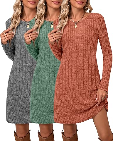 Riyiper 3 Pack Women's Long Sleeve Dresses, Loose Fitting Knit Sweater Tunic Dresses Crew Neck Causal Fall Winter Dresses