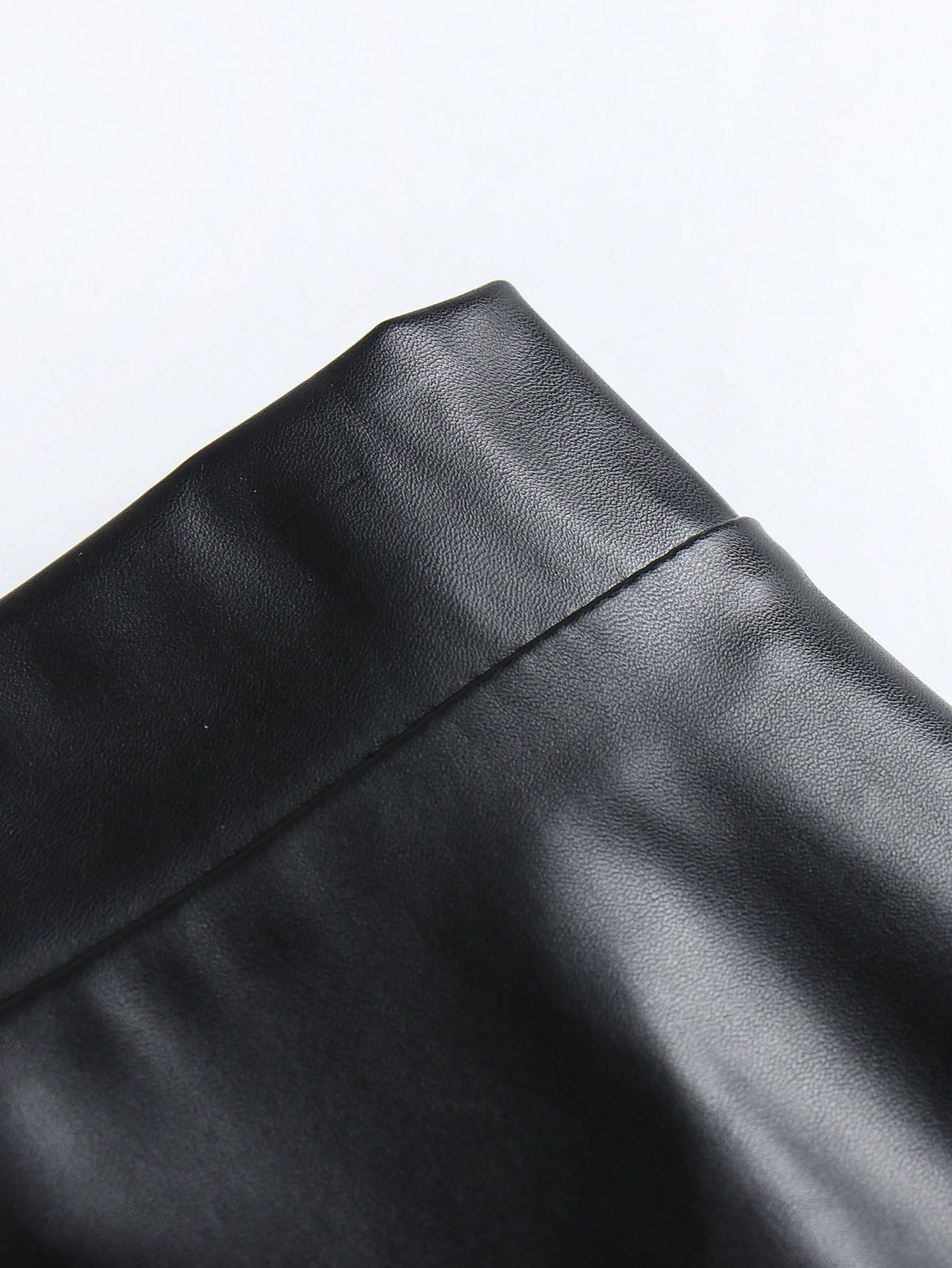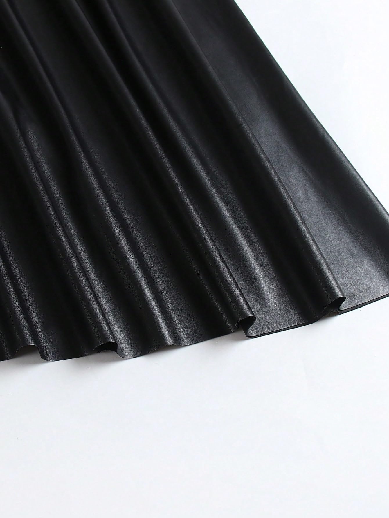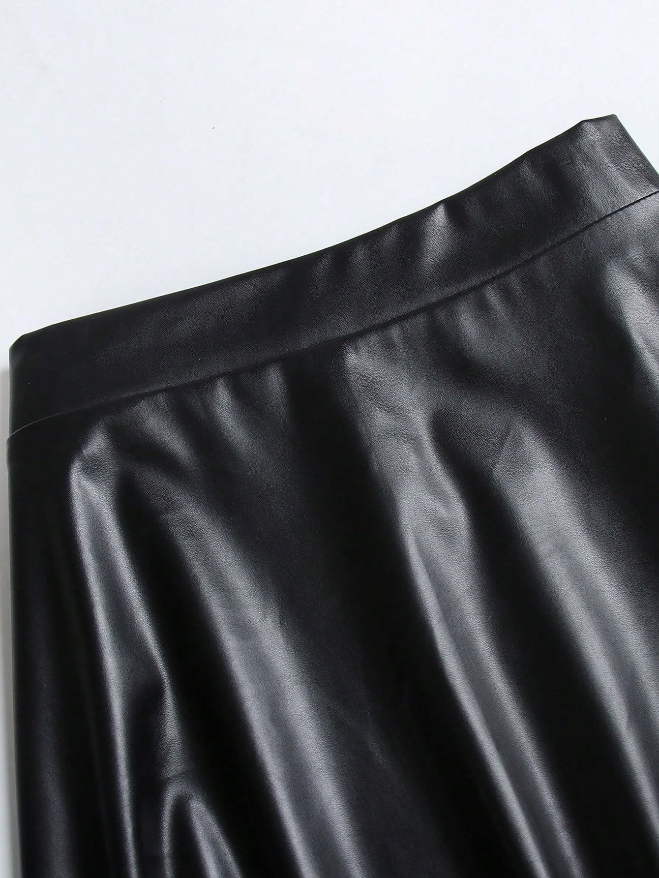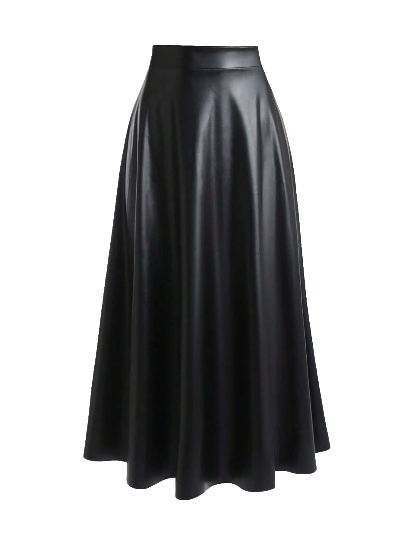 OYOANGLE Women's Elegant PU Leather High Elastic Waist A Line Flared Midi Skirt Black L