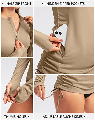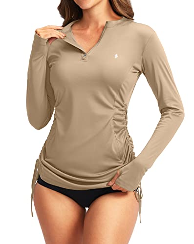 Soothfeel Women's Long Sleeve UV Sun Protection Rash Guard Shirts UPF 50+ Swim Shirt Swimsuits Top for Women with Zip Pockets Khaki