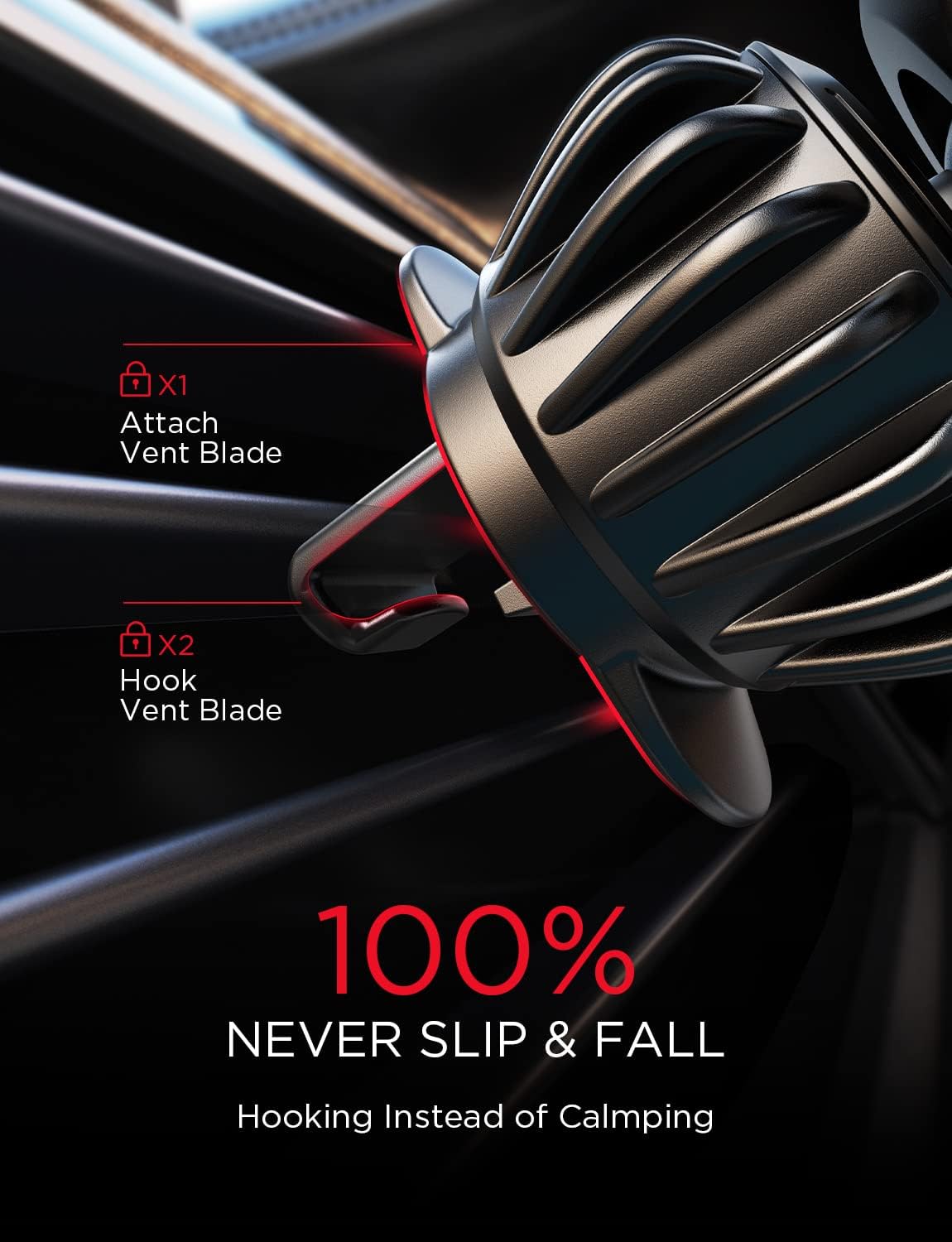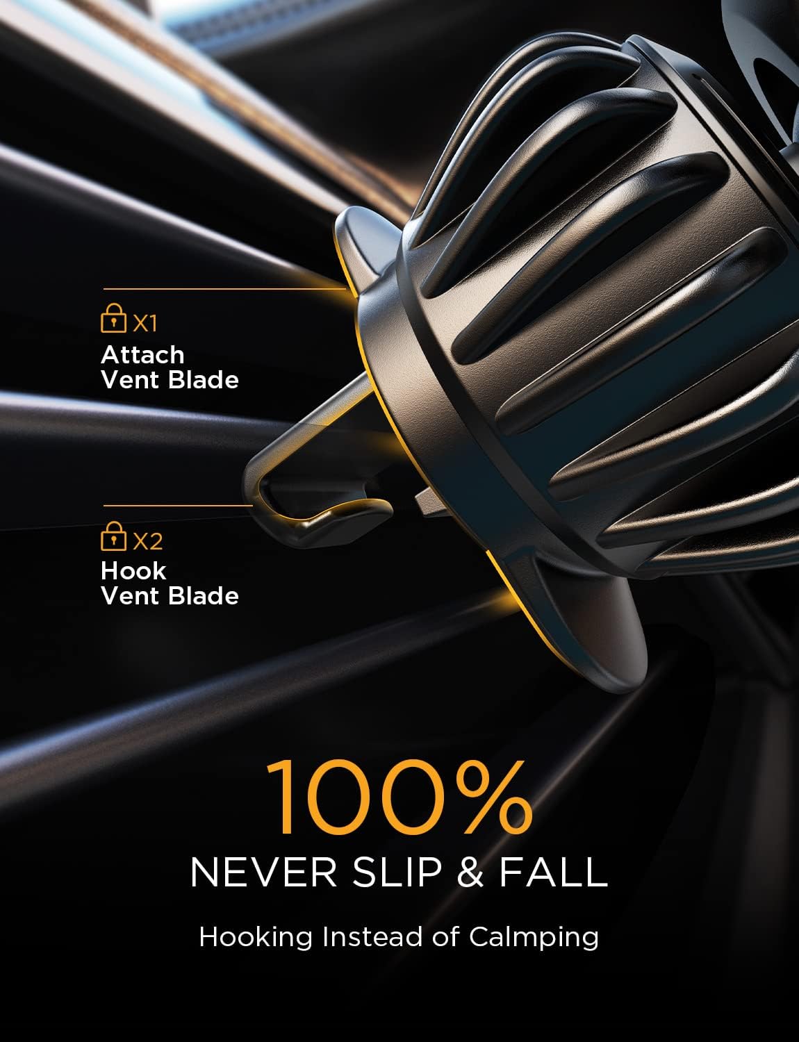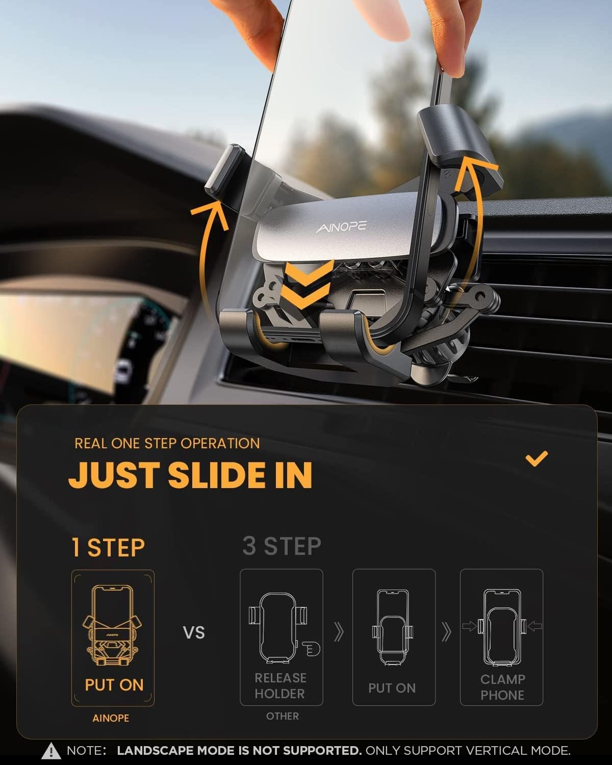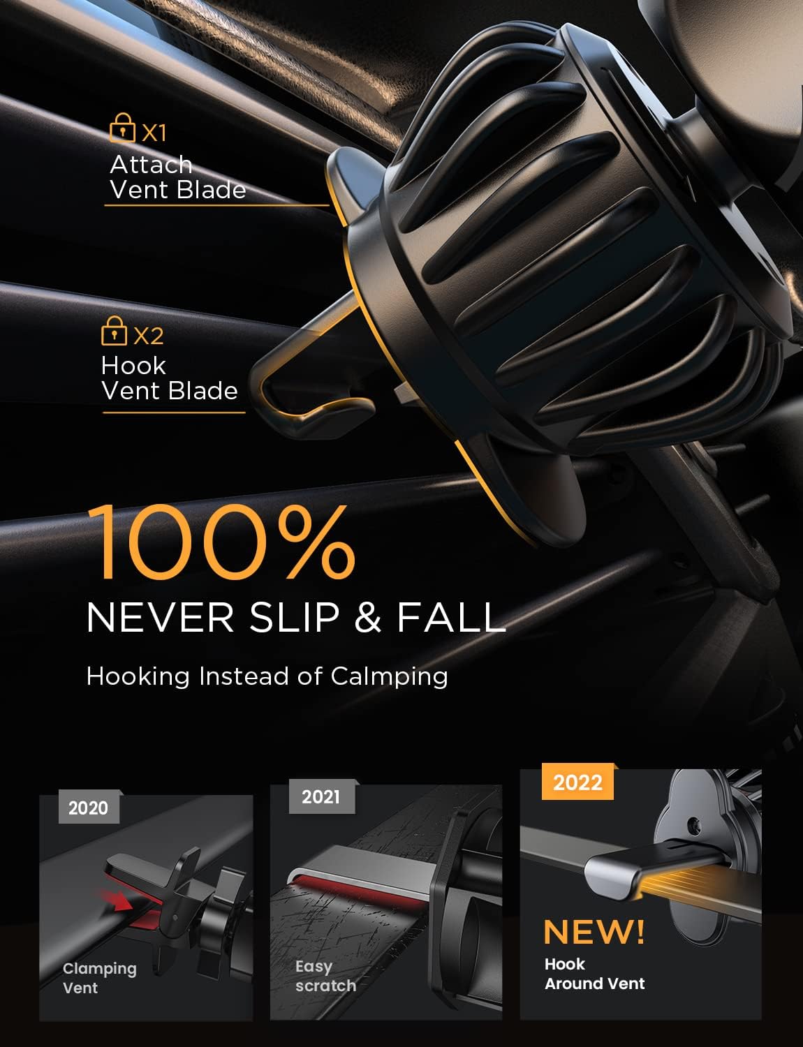 • 👍 UPGRADED AIR VENT HOOK: This car vent phone holder mount is designed as "Hook shape" and form "Three grasp points" which can firmly hook around the a/c vent for no slippage or movement. It solving the market's common problem of falling forward and off the air vent constantly when going over bumps or turns. NOTE: THE LENGTH OF CLAMP BETWEEN 0.41-0.98IN. THIS PHONE HOLDER ONLY COMPATIBLE WITH HORITABLE AIR VENT.