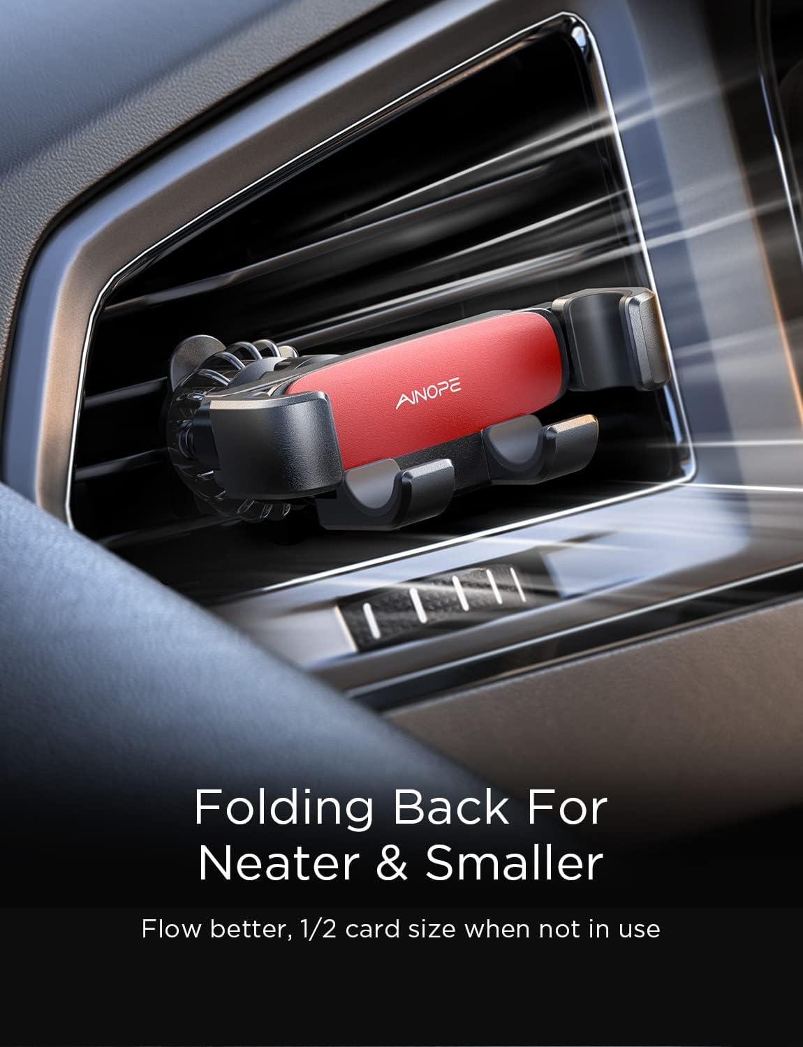 • 👍 NO BLOCK VENT & SAFER DRIVING: This car vent phone mount with folding back structure is very neat and keep it small when not in use, only 1/2 card size and 3 inches away from the vent to still allow air flow. You can have a wider sight and adjust this gravity car phone holder up/down or left/right. NOTE: THE HORIZONTAL MODE IS NOT SUPPORTED.