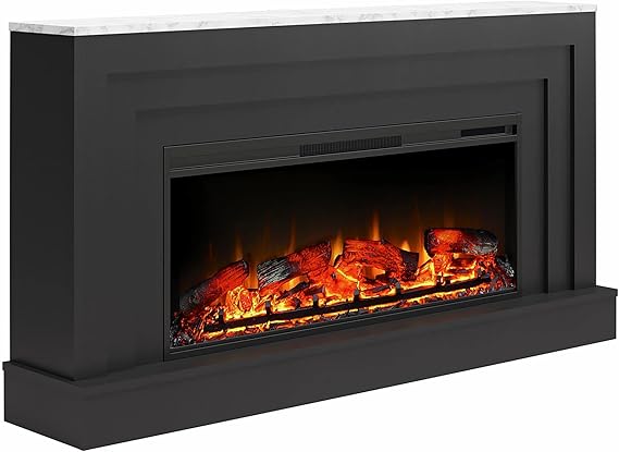 Ameriwood Home Lynnhaven 61 Inch Electric Fireplace with Mantel, Replaceable Fireplace Insert Heater, Remote Control, Timer, Realistic Log and Flame Effect, for Living Room or Bedroom, Matte Black