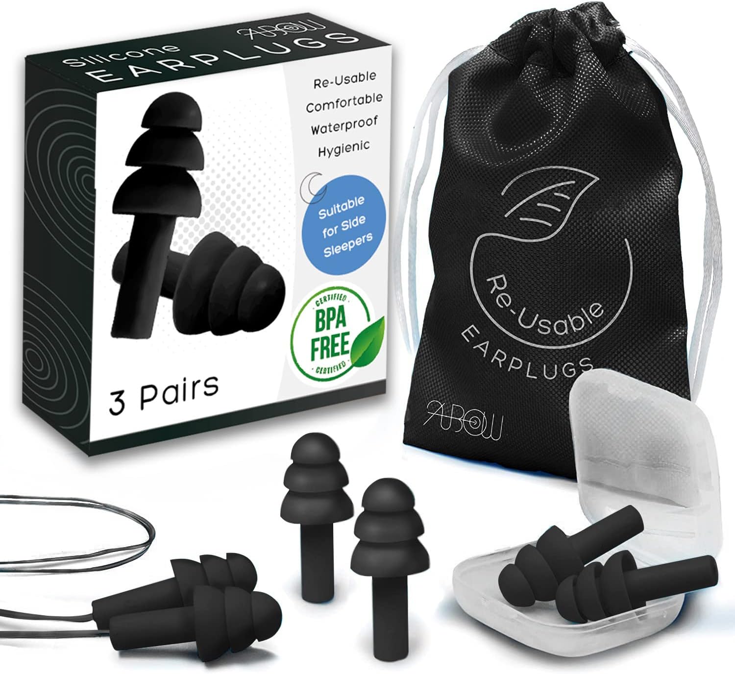 ANBOW Soft Ear Plugs for Sleeping Noise Cancelling. Ear Plugs for Swimming, Concerts, Travel, Work, Snoring & Concentration. Reusable Silicone Earplugs with Adjustable Size. 3 Pairs + Travel Pouch